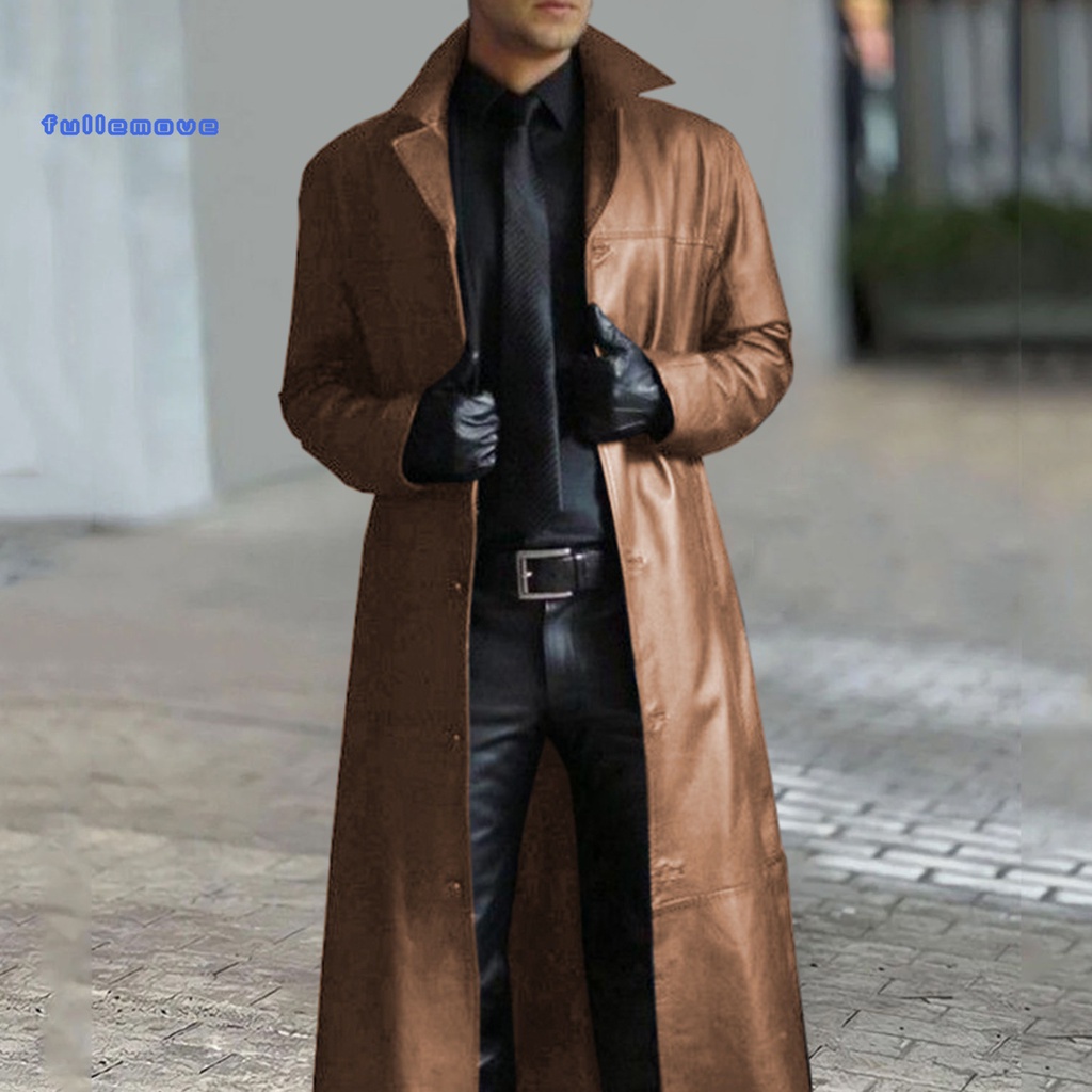 Men Jacket Turn-down Collar Smooth Solid Color Faux Leather Windproof Streetwear Slim Fit Long Sleeve Men Trench Coat