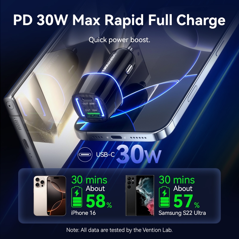Vention 48W Fast Car Charger 6A Dual Ports (Type-C and USB) Quick Charge 3.0 Support For iPhone/Samsung/Huawei Plastic Body LED Display