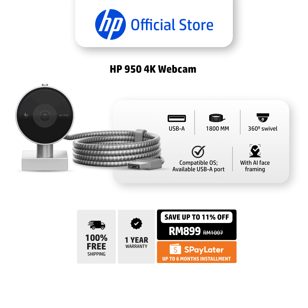 HP 950 4K High Res Webcam / 360º swivel / With AI face framing / Dimensions (cm) : 6.7 x 4.5 x 6.57