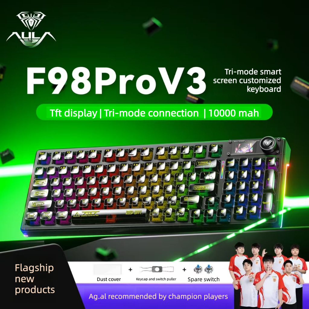 Ready stock Aula F98pro V3 three-mode transparent RGB mechanical keyboard customized screen display Gasket structure hot swappable RGB