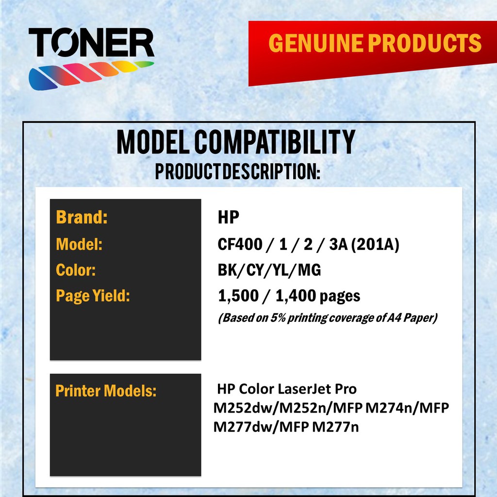 Genuine Original Toner - HP 201A - CF400A/CF401A/CF402A/CF403A (CMYK ) - LaserJet Pro M252dw/M252n/M274n/M277dw/M277n