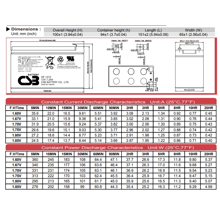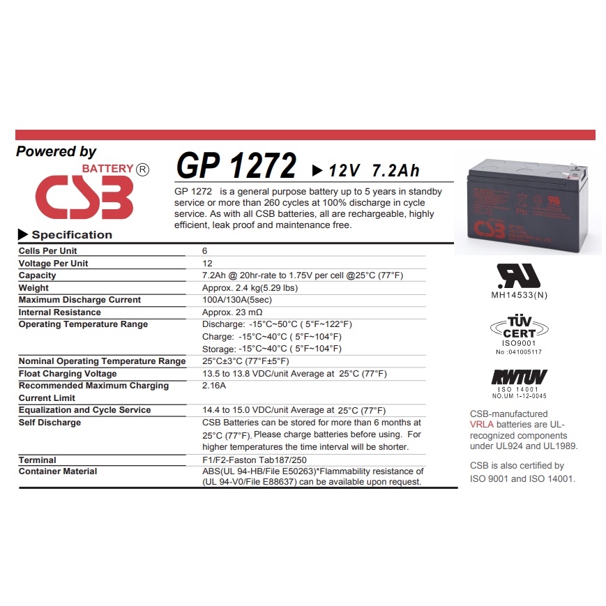 CSB GP 1272 12V 7.2AH VRLA/AGM/UPS/SLA | Auto-Gate/Alarm/Fire-Alarm | BATTERY