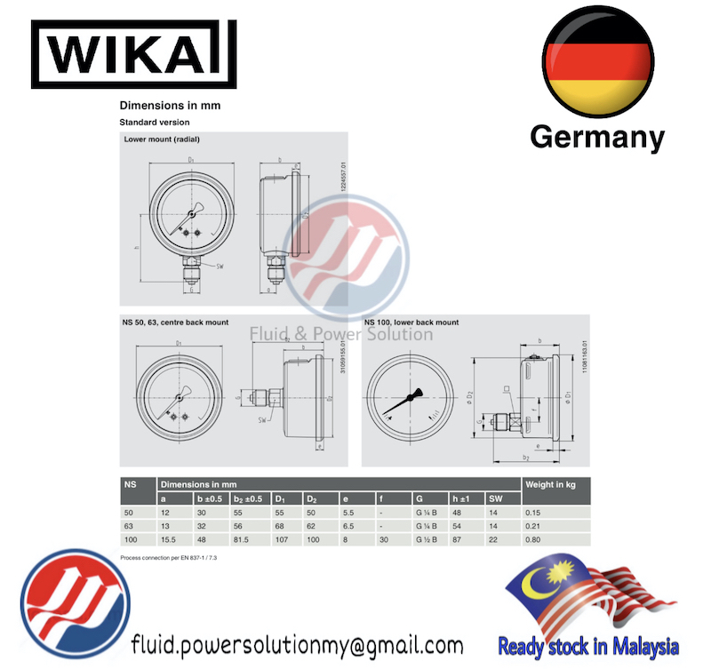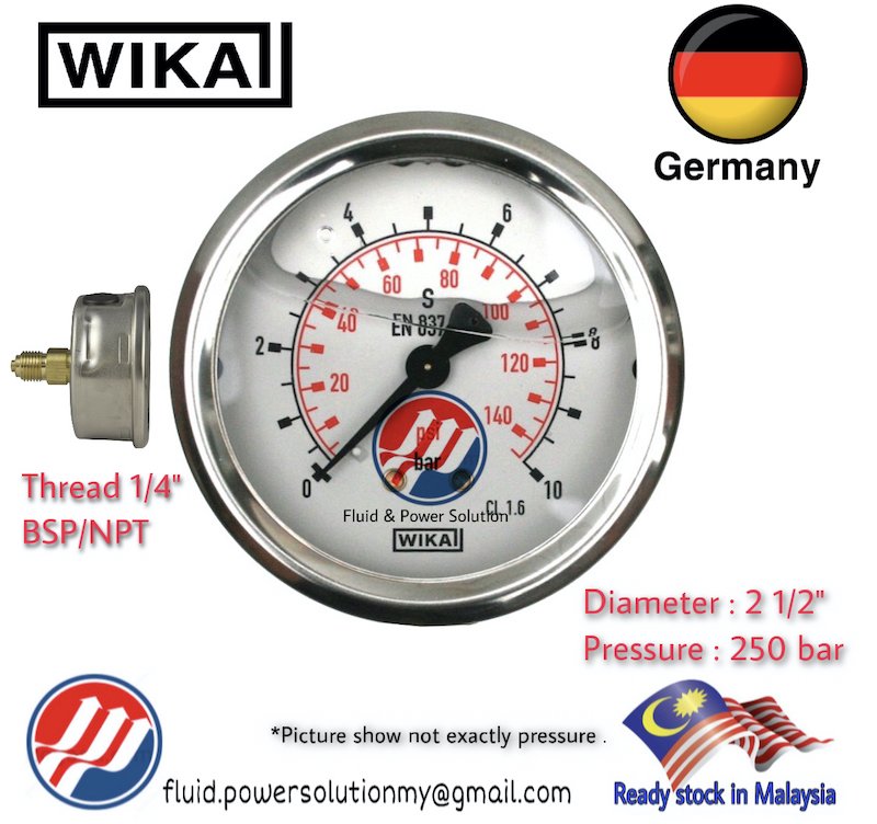 " WIKA " 100% Original Pressure Gauge , 0~250 Bar Diameter 2" 1/2 (Diameter 63mm), 1/4" BSP and NPT Back Connector .