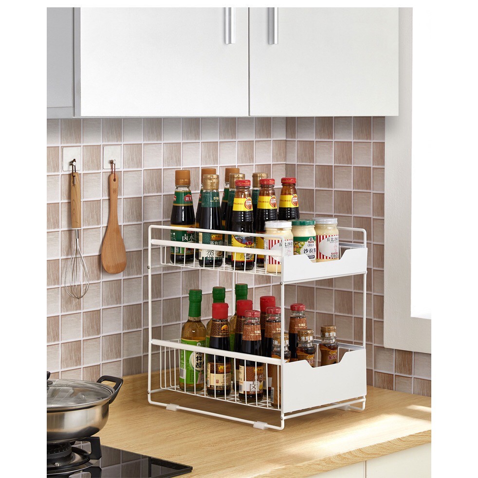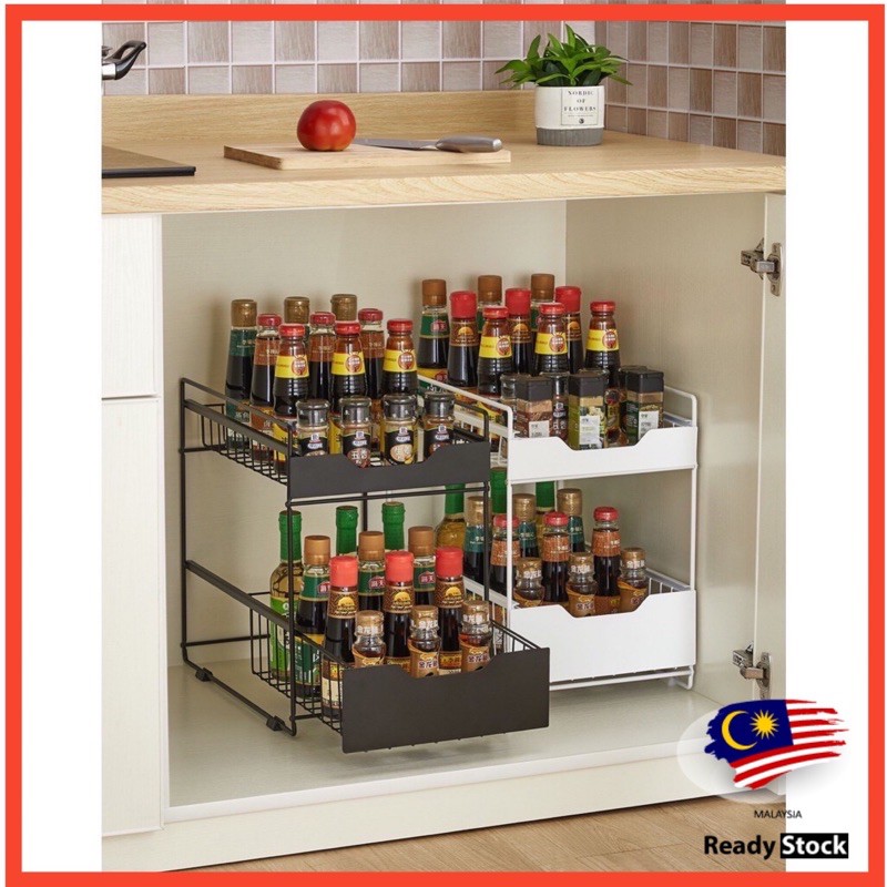 2 Tier Sliding Drawer Pull Out Organizer Countertop Cabinet Basket Pantry Undersink Storage Rak Laci Bawah Sinki 0163