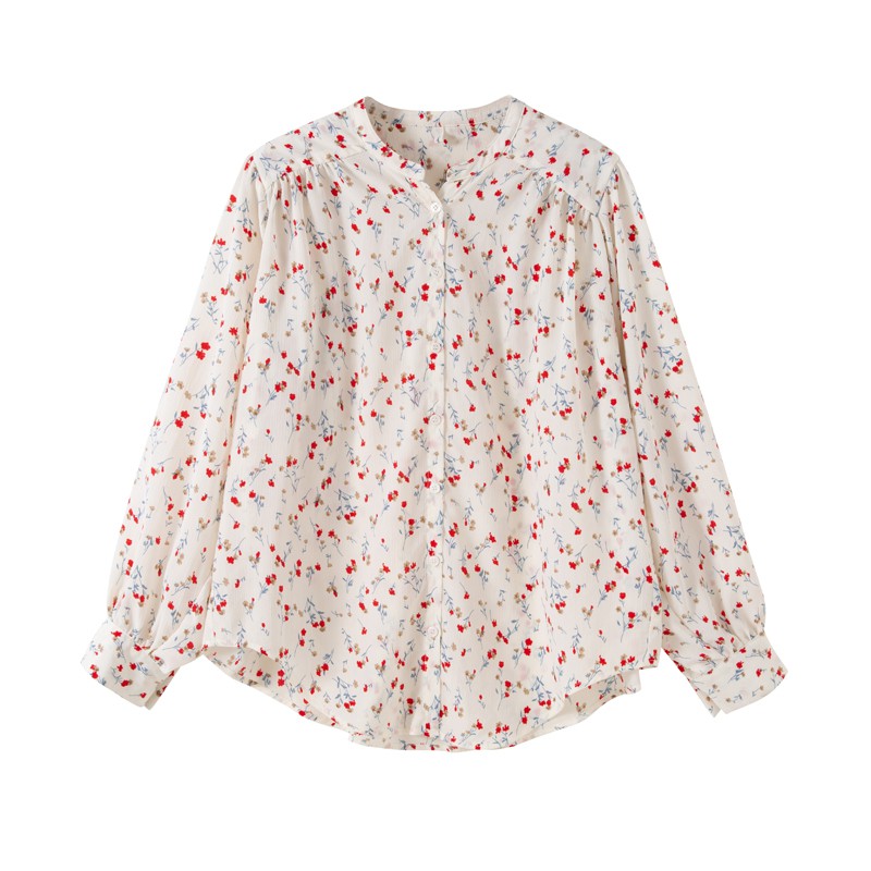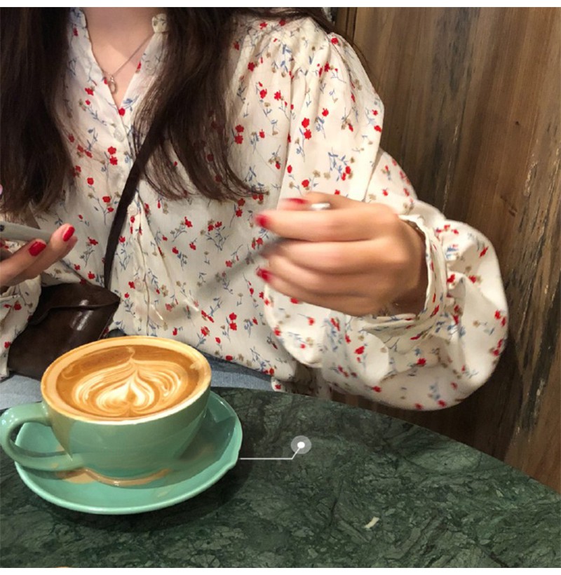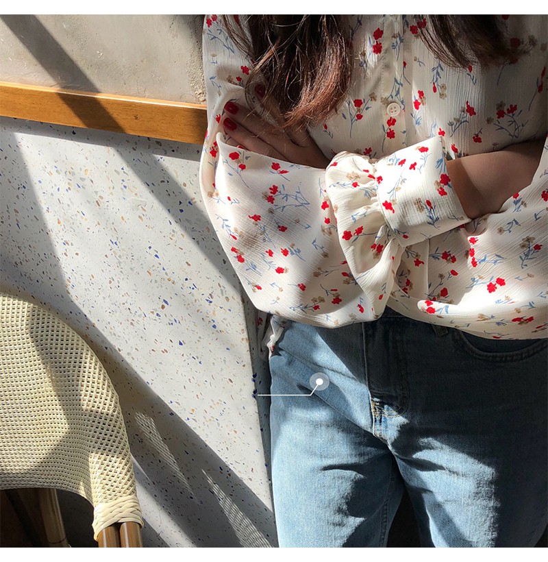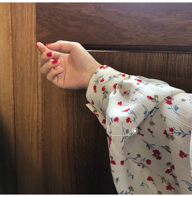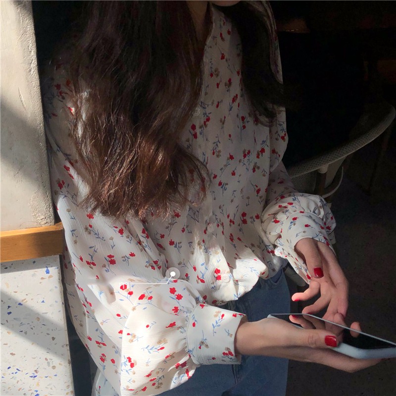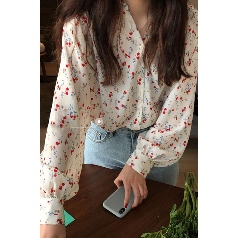 Autumn Korean Casual Floral Top Women's Loose Chiffon V-Neck Long Sleeve Blouse