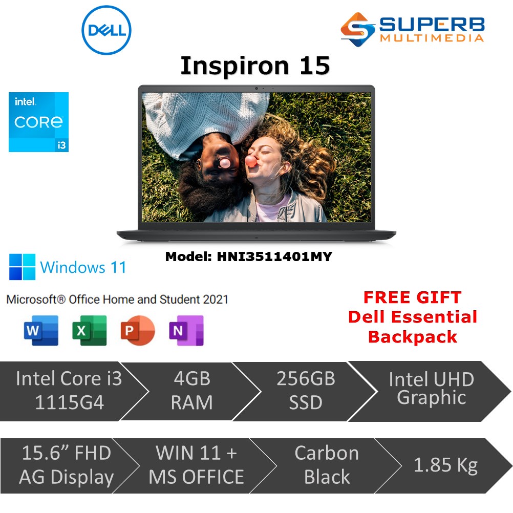 Dell Inspiron 15 HNI3511401MY Laptop (Intel Core i3 1115G4, 4gb ram, 256gb ssd, Intel UHD Graphic, 15.6" FHD, Win11, OPI 2021, Carbon Black)