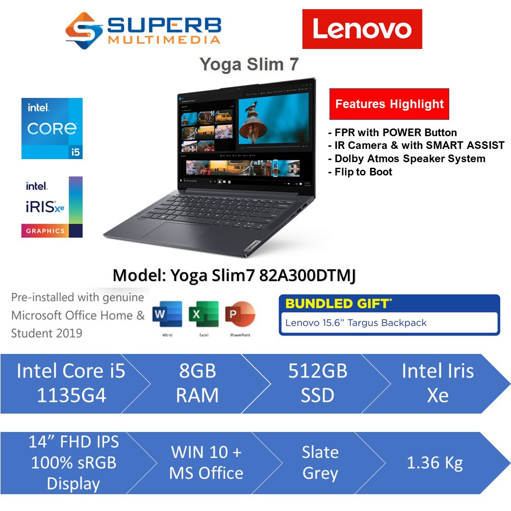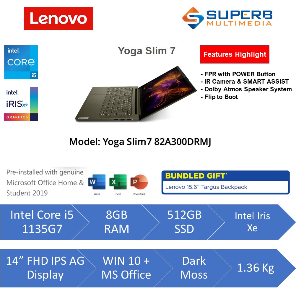Lenovo Yoga Slim7 82A300DTMJ Grey or 82A300DSMJ Orchid or 82A300DRMJ Moss Laptop (Intel Core i5 1135G7, 8gb ram, 512gb ssd, Intel Iris Xe, 14" FHD IPS 100% sRGB, Win10, OPI)