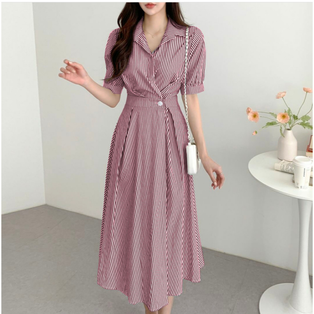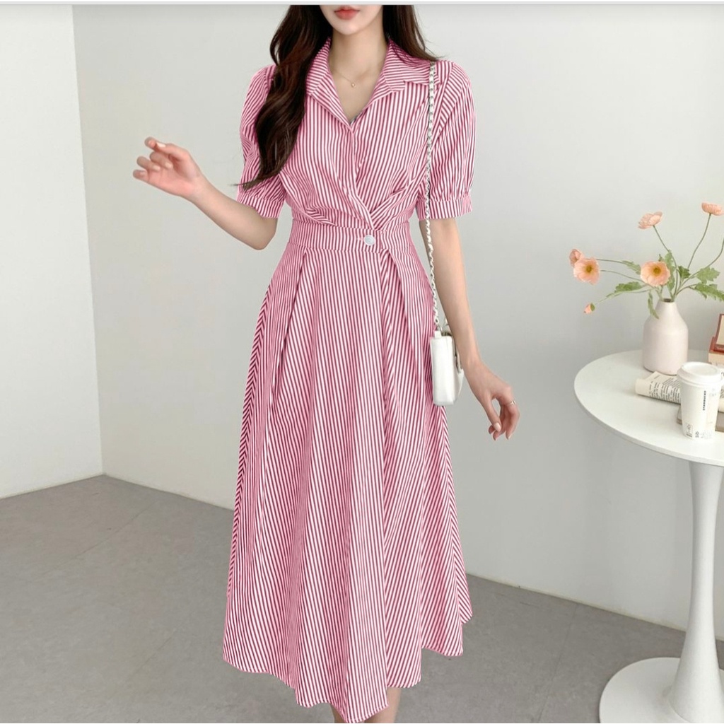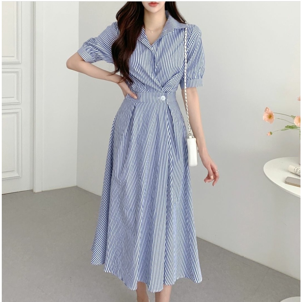 FWG - GANI STRIPE DRESS / WOMEN'S DRESS / KOREAN WOMEN'S DRESS / STRIPE DRESS / DRESS / WOMEN'S CLOTHING DRESS DINNER ELEGANT / STRIPED COTTON DRESS / V NECK DRESS / MIDI DRESS / CASUAL DRESS