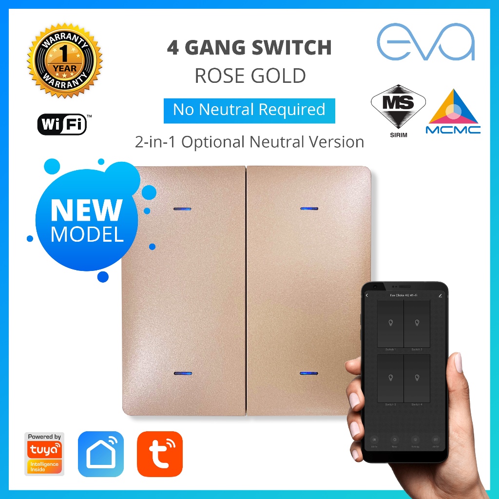 [SIRIM] Eva WiFi Mechanical 1/2/3/4 Gang Click Switch No Neutral, No Capacitor, Max 500W, Works on Tuya Smart Life App