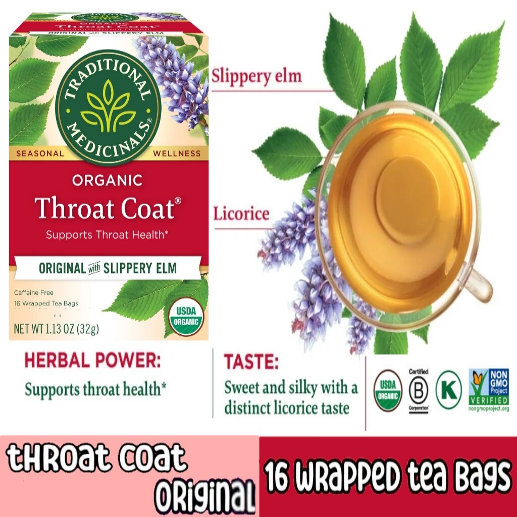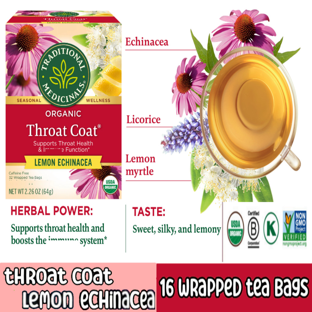 Traditional Medicinals, Organic Throat Coat Tea, Original with Slippery Elm/ Lemon Echinacea/ Eucalyptus Tea, 16 Tea bag