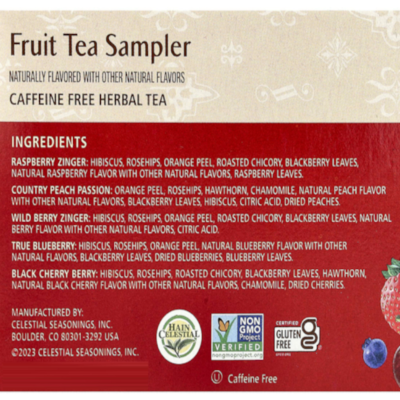 Celestial Seasonings, Fruit Tea Sampler 5 Flavors, Caffeine Free, 18 Tea Bags, raspberry country peach wild berry cherry