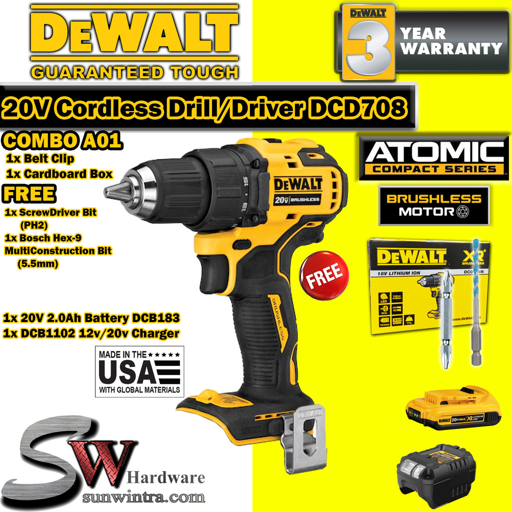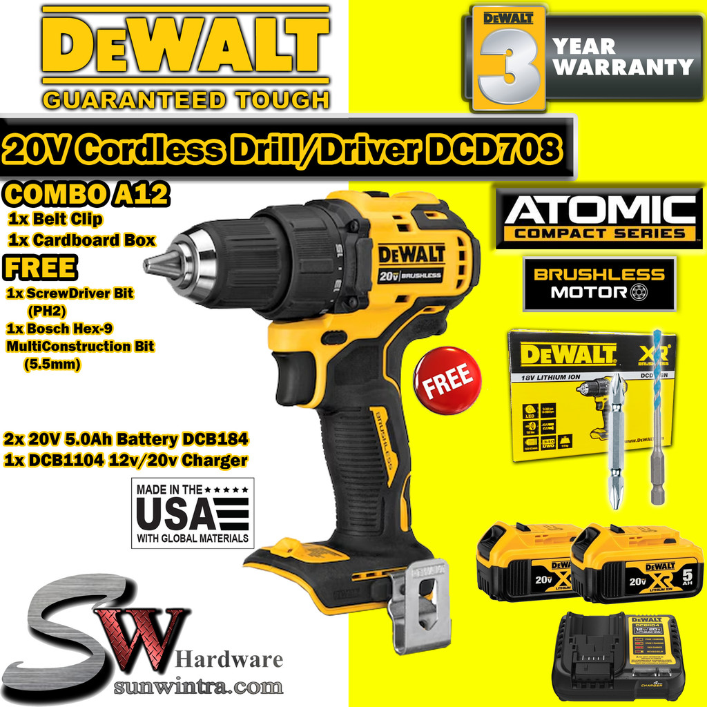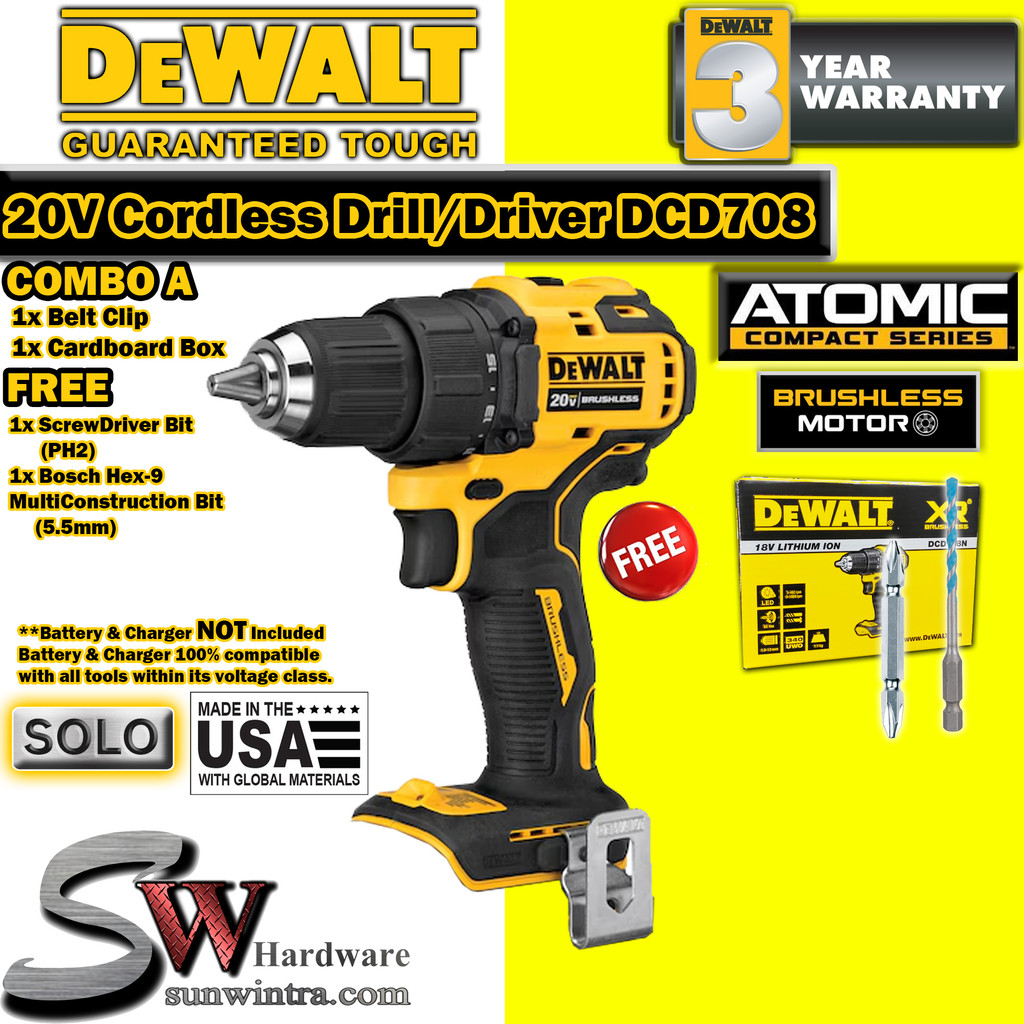 COMBO DeWALT ATOMIC 20V MAX* Brushless Compact 13mm Drill/Driver Kit DCD708 DCD 708 F.O.C Drill Driver Bit