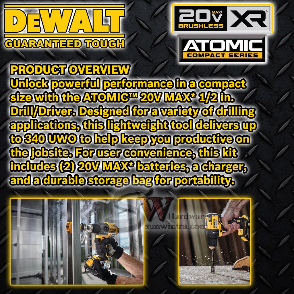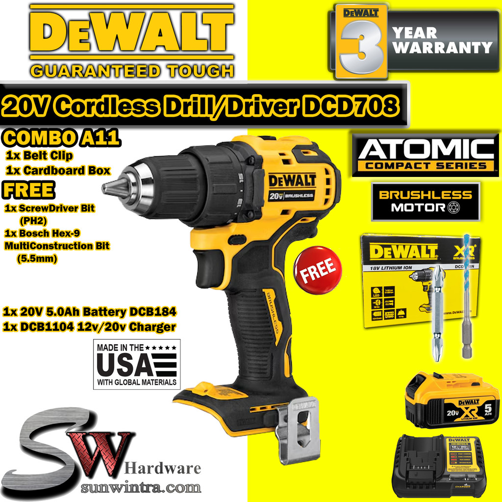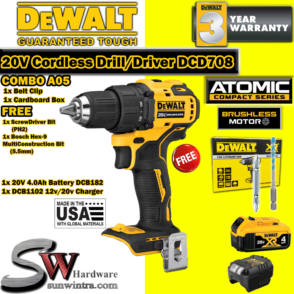 COMBO DeWALT ATOMIC 20V MAX* Brushless Compact 13mm Drill/Driver Kit DCD708 DCD 708 F.O.C Drill Driver Bit