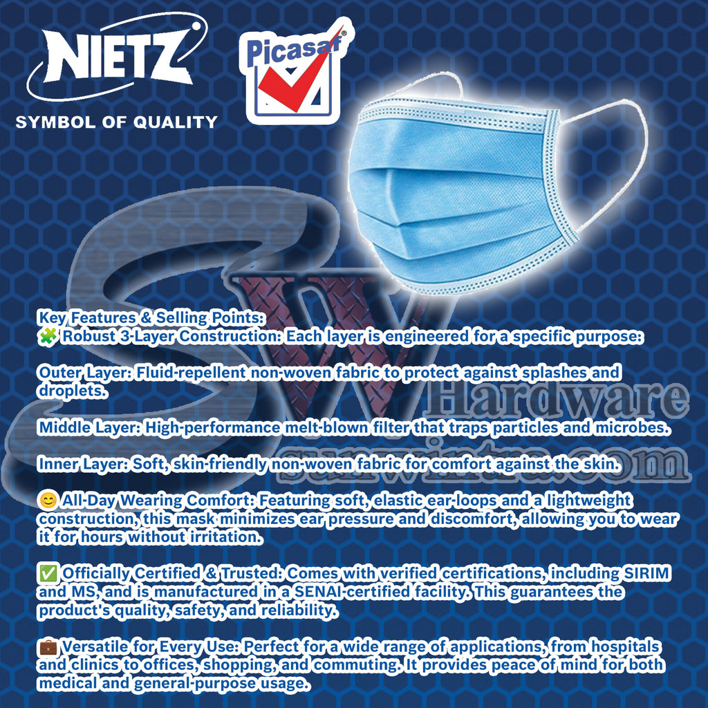 NIETZ | PICASAF 3 PLY MEDICAL DISPOSABLE FACE MASK SIRIM (50PCS) / PELITUP MUKA 3 LAPIS (50KEPING) (STOCK TERSEDIA)