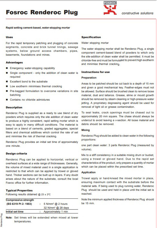 FOSROC RENDEROC PLUG / HYDROPLUG # 1KG / 4.5KG WATERPLUG / SIMEN CEPAT KERING