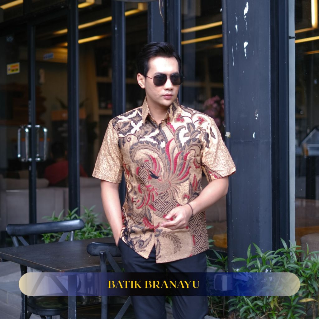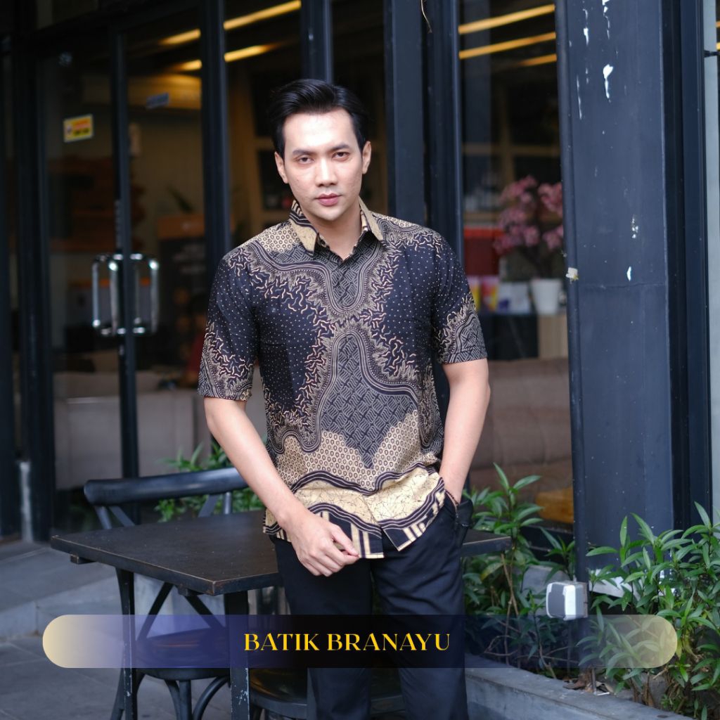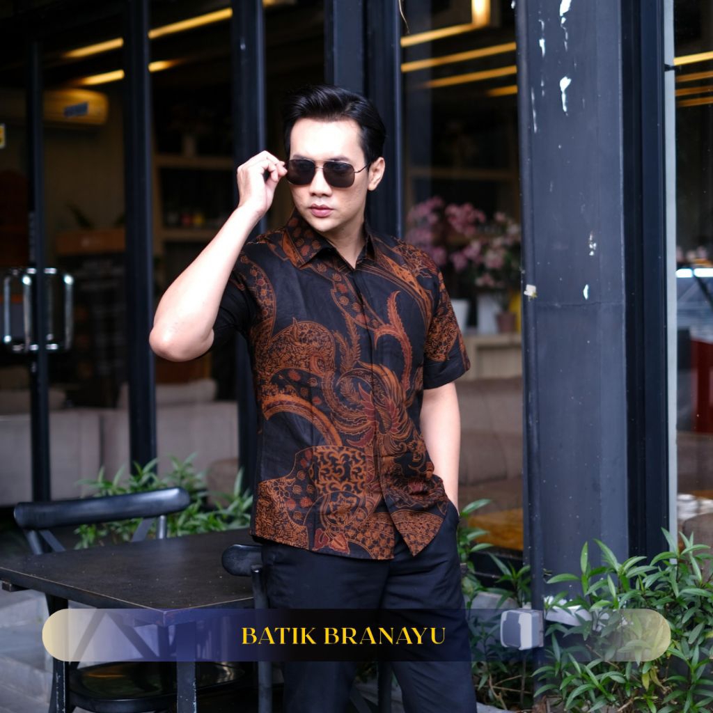 KEMEJA BATIK BRANAYU Andara Motif brown black Men's Batik Shirt Slimfit Full Lining Short Sleeve