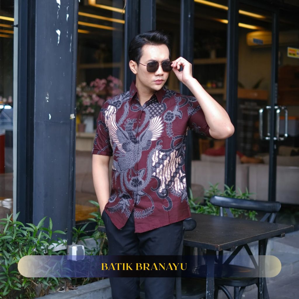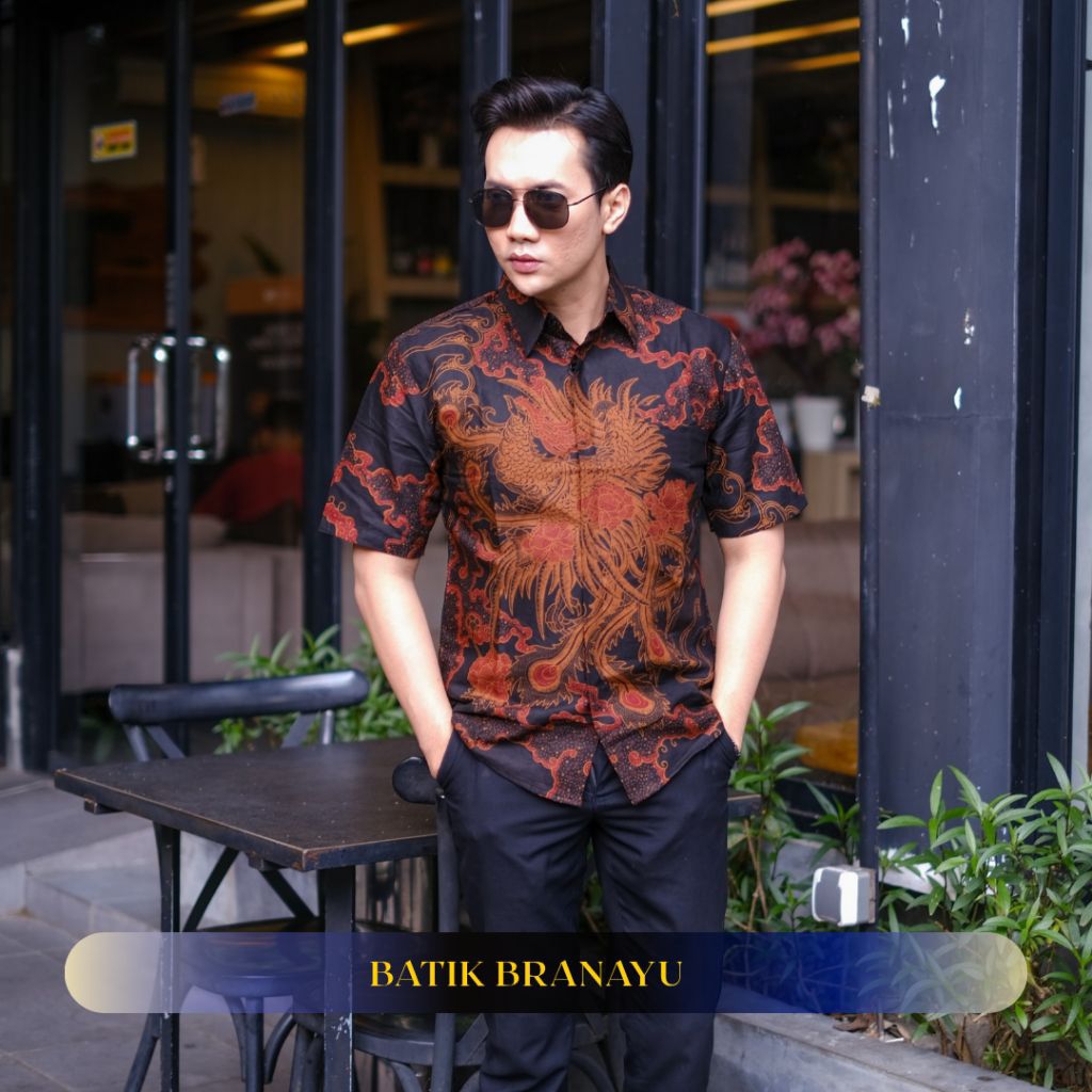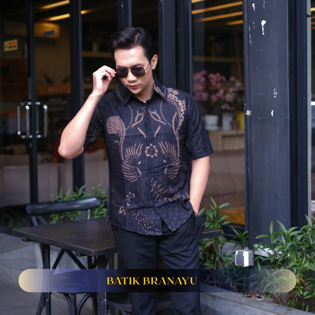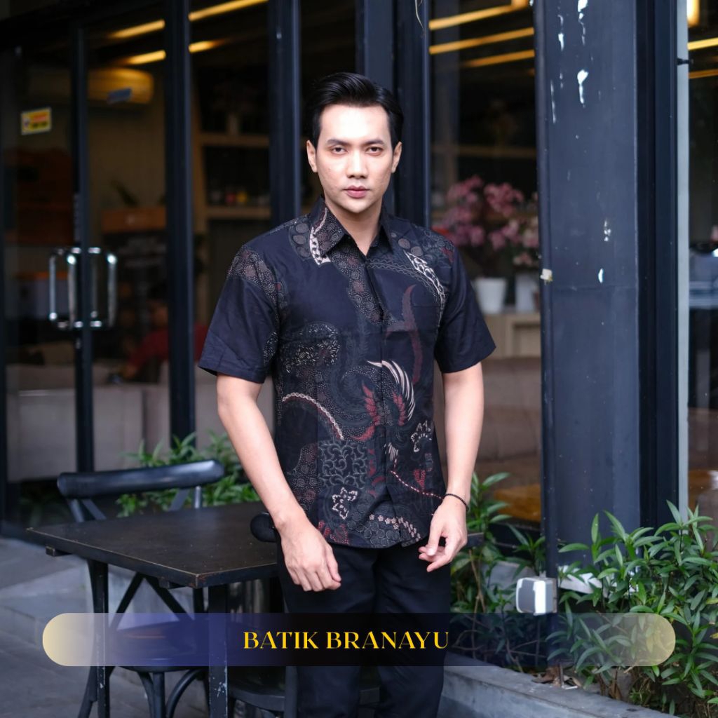 KEMEJA BATIK BRANAYU Andara Motif brown black Men's Batik Shirt Slimfit Full Lining Short Sleeve