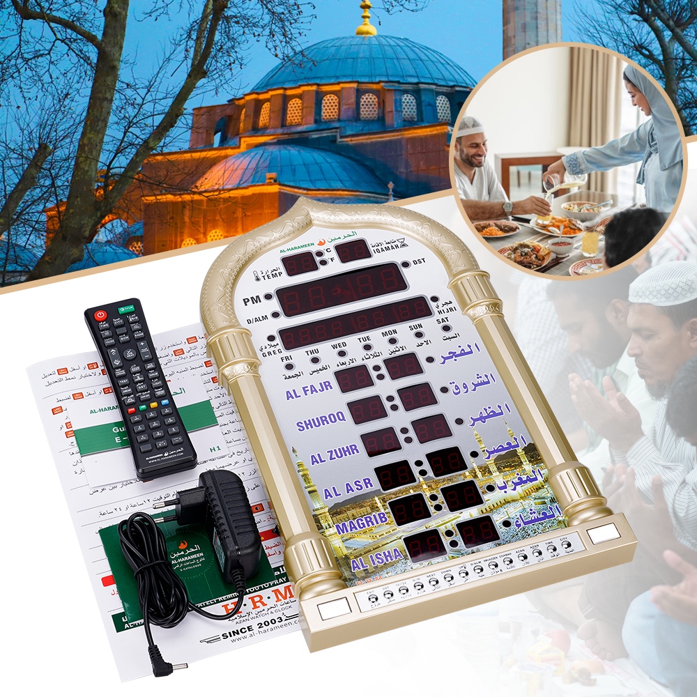 12V Azan Mosque Prayer Clock Islamic Mosque Azan Calendar Muslim Prayer Wall Clock Alarm Ramadan Home Decor + Remote Con