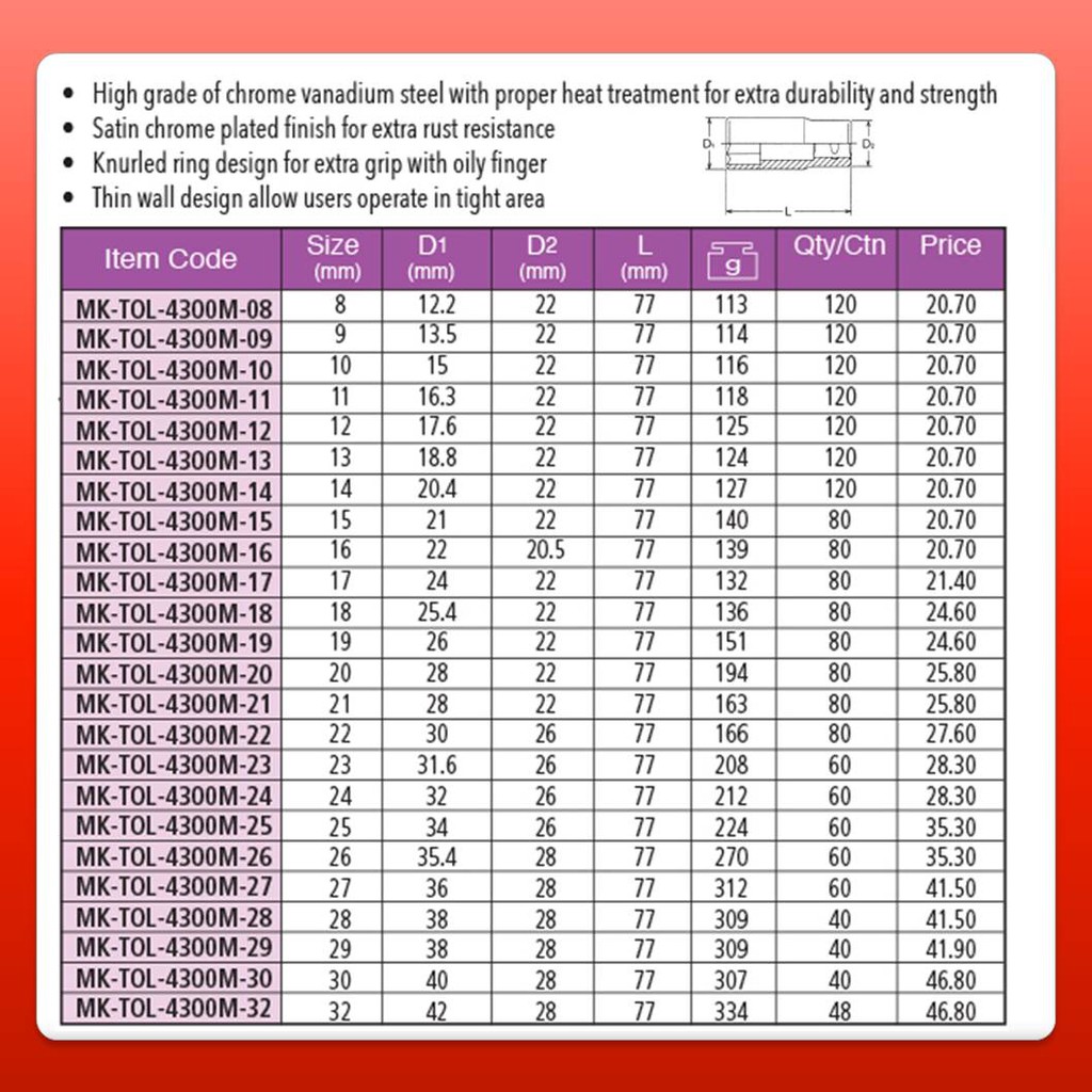 MK-TOL-4300M (27-32mm) Mr Mark 1/2" 6-point Deep Socket CRV Hand Socket