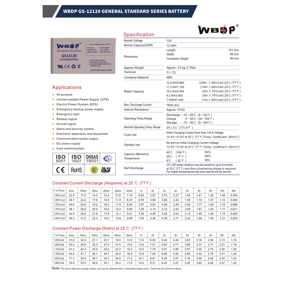 WBDP GS12120 General Standard Series Battery 12Ah Nominal Capacity
