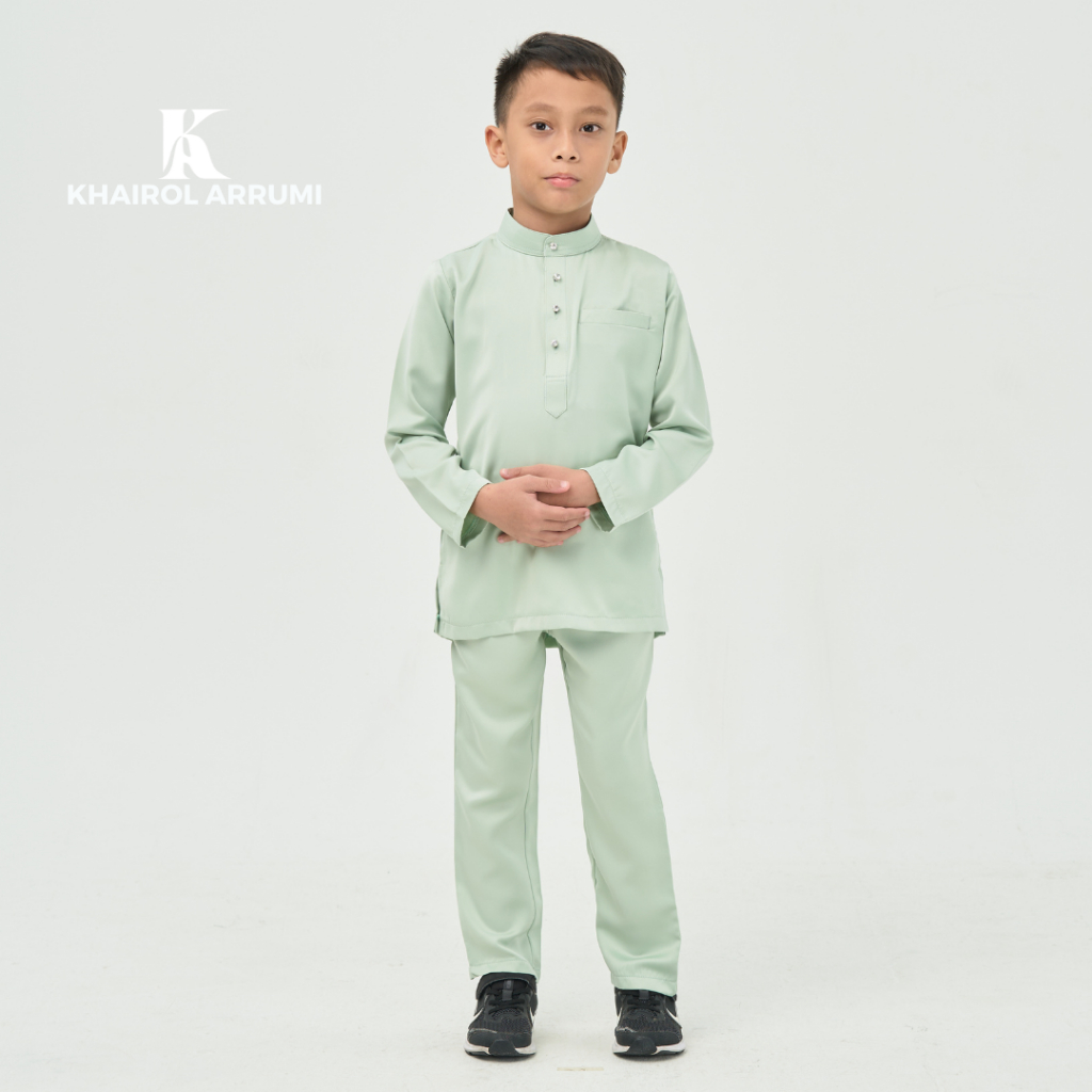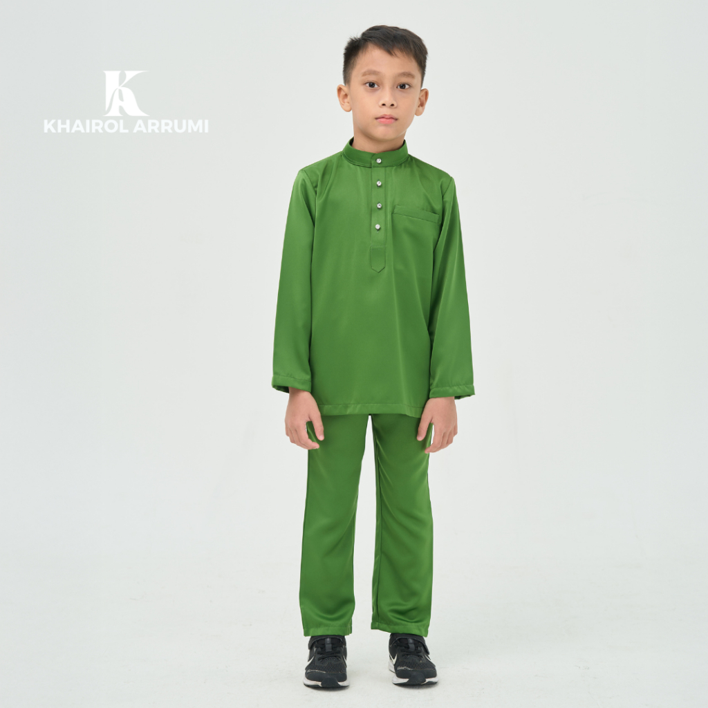 KHAIROL ARRUMI Baju Melayu Kanak-Kanak 1-12Y Cekak Musang Satin Budak Green Hijau Mint Emerald Fit 2 3 4 5 6 7 8 9 10 11