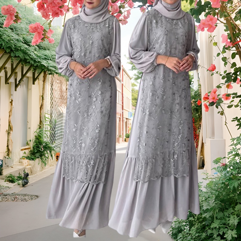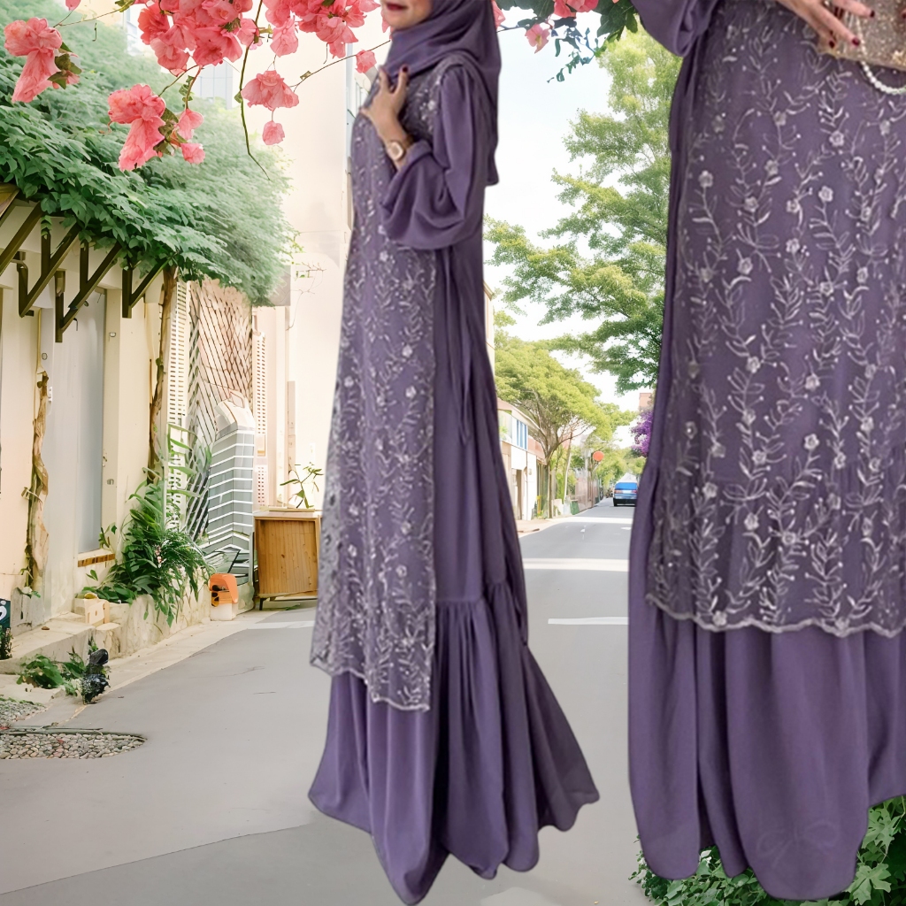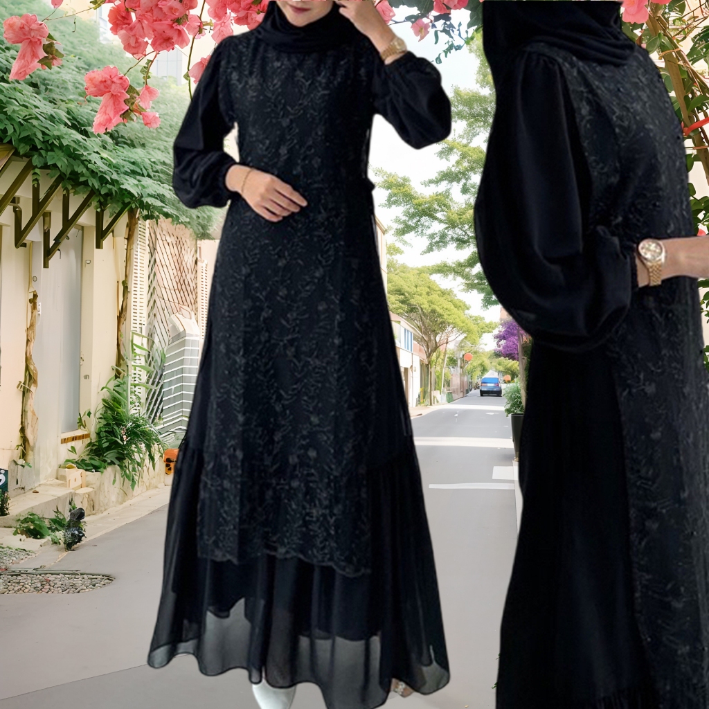 Set GAMIS+OUTER TILLE NO Jubah Abaya Dress Hitam with Lace Outerwear Long Dress Pleated Dress Jubah Muslimah Dress