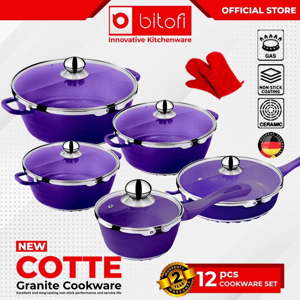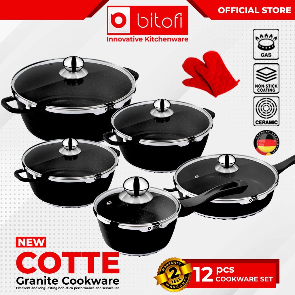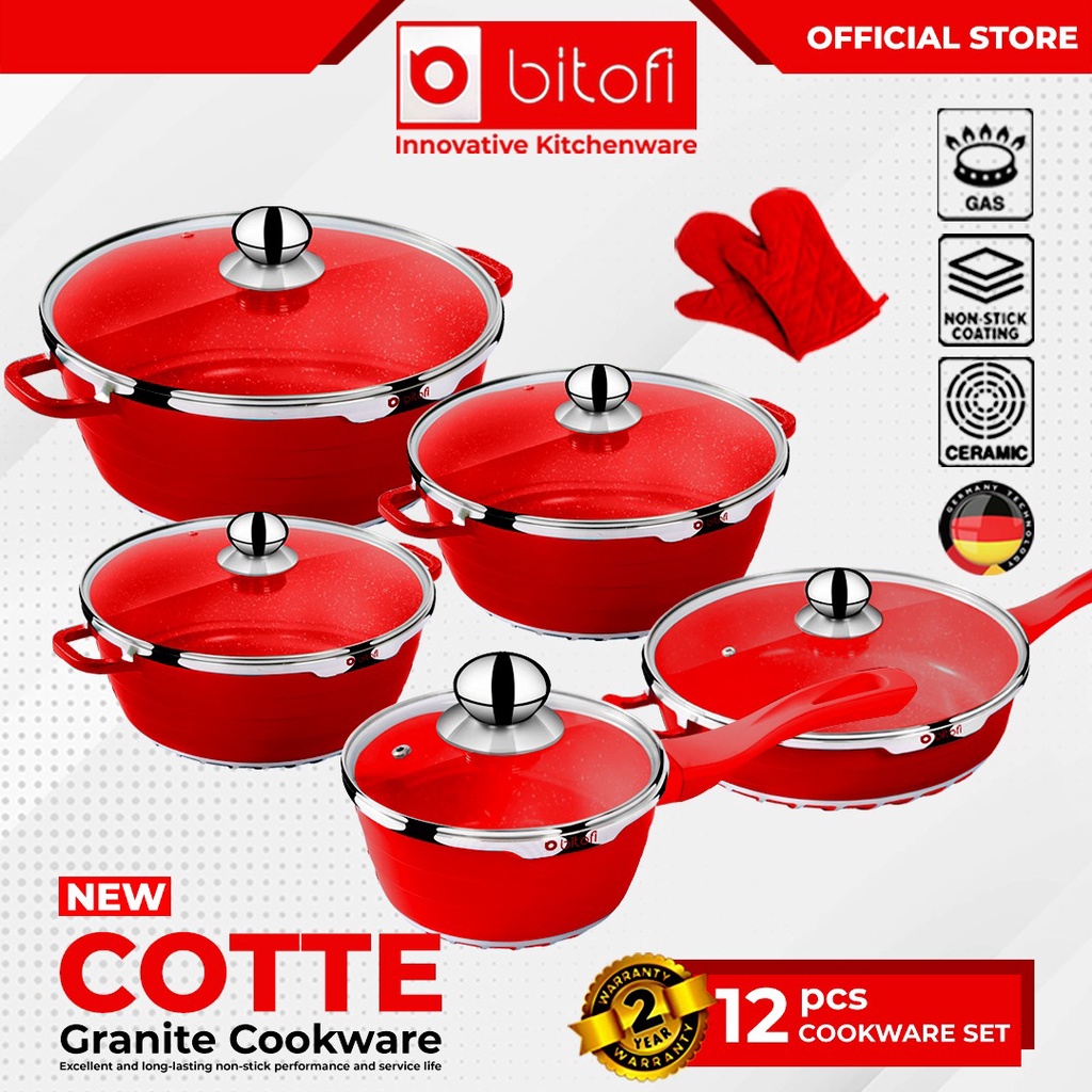 BITOFI GERMANY COTTE 12PCS Cookware Set Non Stick Granite Cooking Pot Frying Pan Set Kitchen Cookware-WINERED