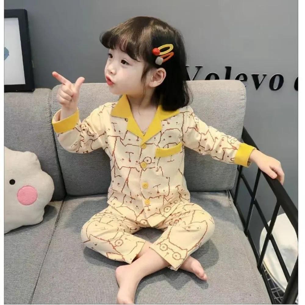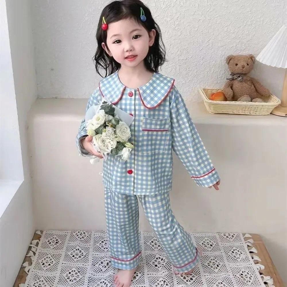 Bear Leader Autumn Kids Sleepwear Home Wear Korean Version Long Sleeved Checkered Girls Clothes Cartoon Print Top + Pants Two-piece Set