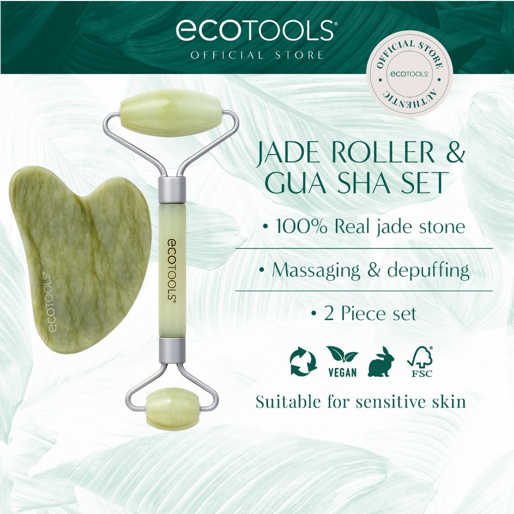 EcoTools 100% Real Jade Stone Facial Roller and Gua Sha Set (Skin Care Face Roller, Sculpting Massager Tools)
