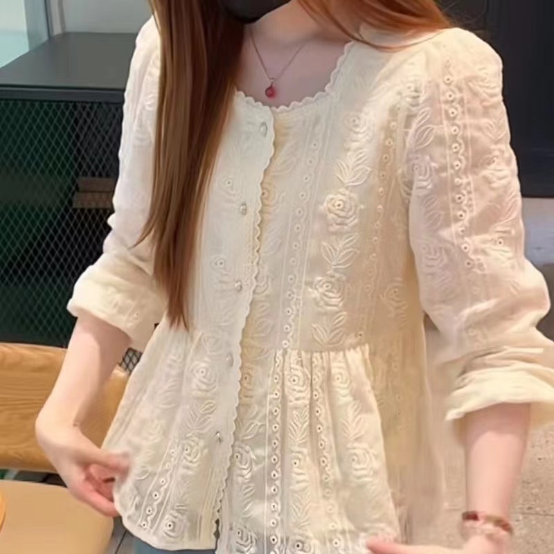 Korean Style Women Ladies Loose Vintage Embroidery Flower Square Neck Long Sleeve Shirt Blouse Baju Baju Wanita Lengan Panjang