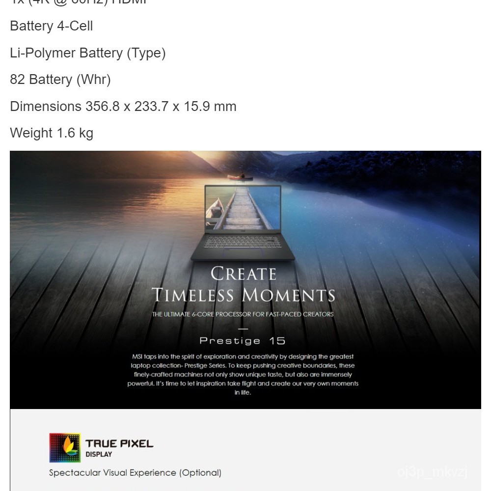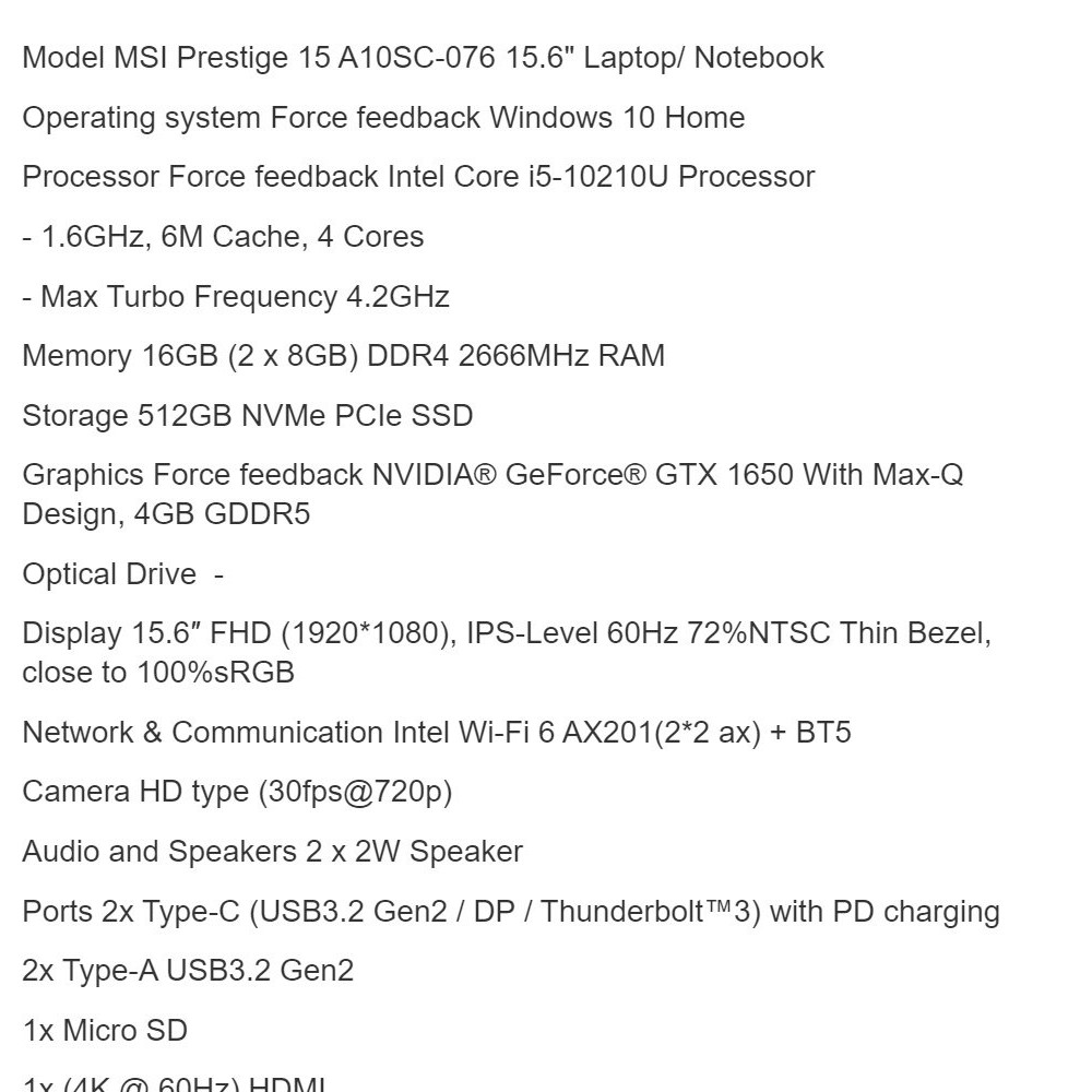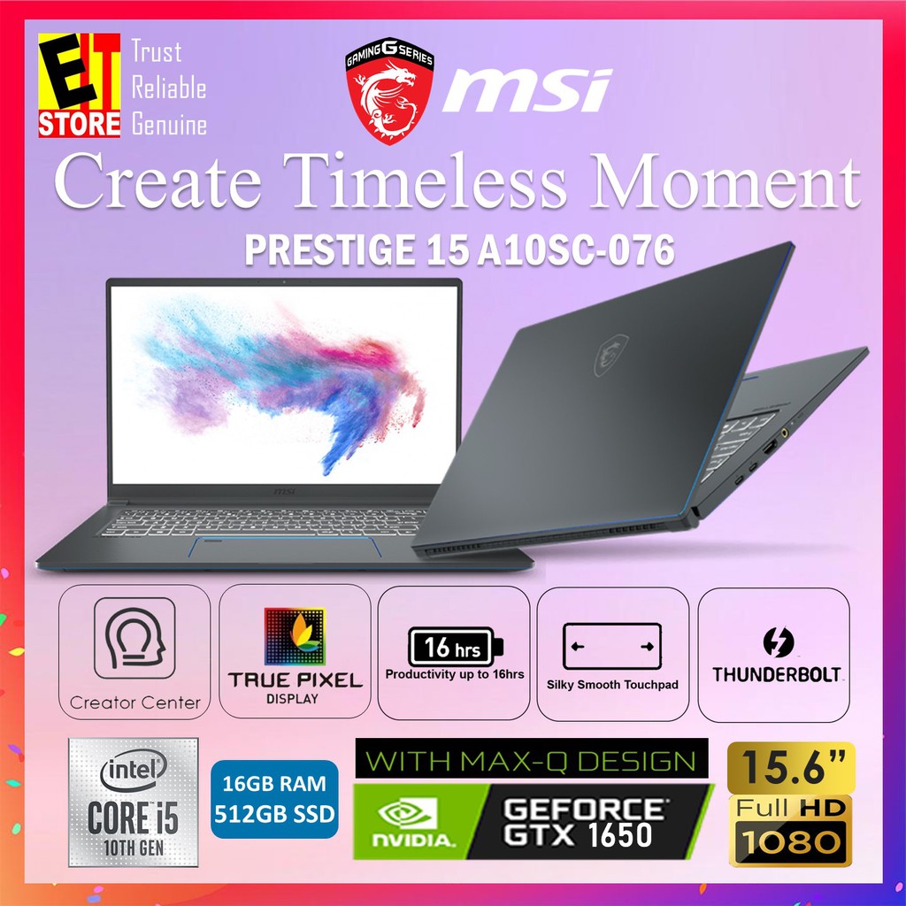 hLlO MSI PRESTIGE 15 A10SC-076 LAPTOP (I5-10210U/16GB (2 x 8GB)/512GB SSD/15.6" FHD 60HZ/GEFORCE GTX 1650 MAX-Q 4GB GDDR