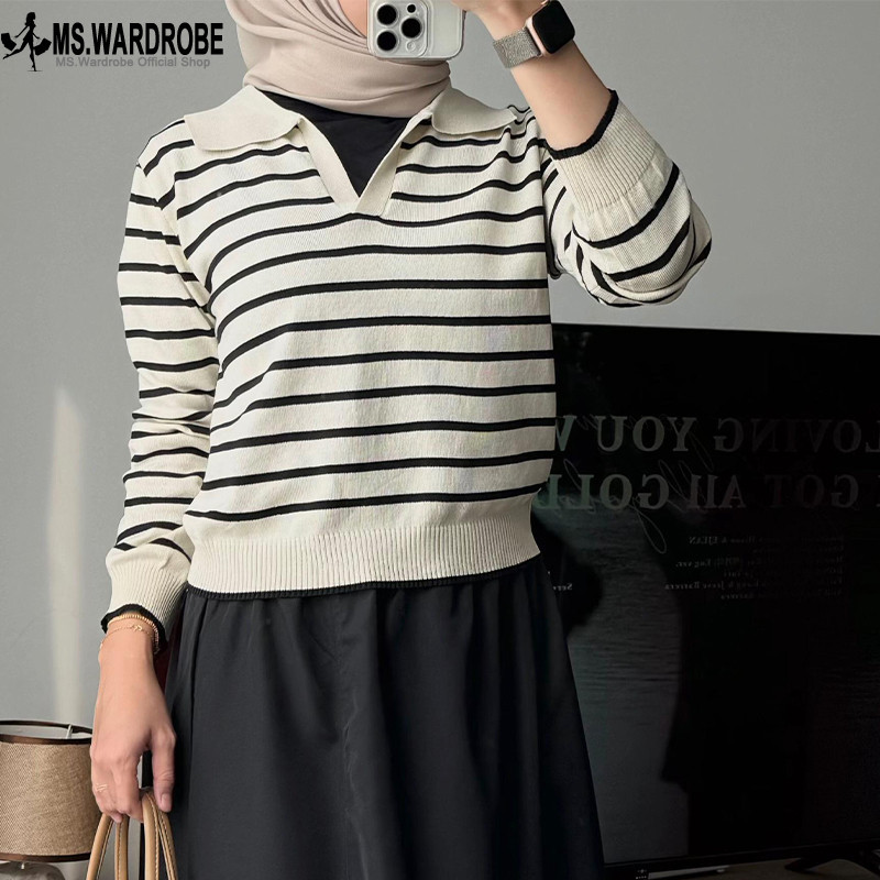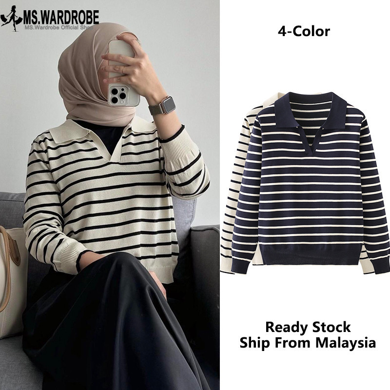 Ready Stock Korean Baju Blouse Atasan Kerah Rajut Wanita Kaos Berkerah Polo V Neck Tali Serut Style Korea Knitted Top