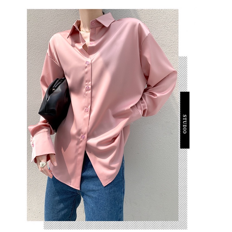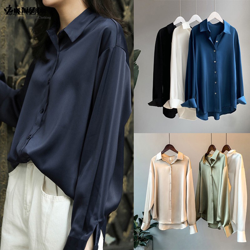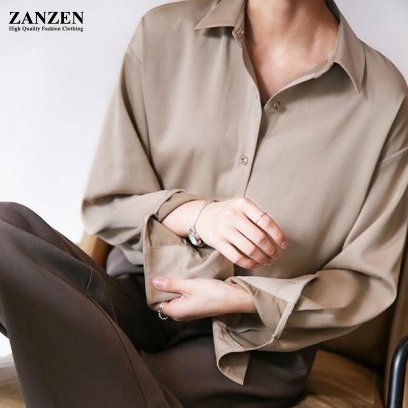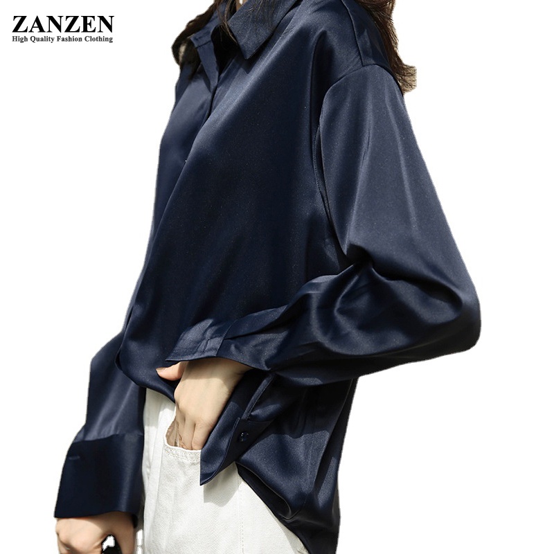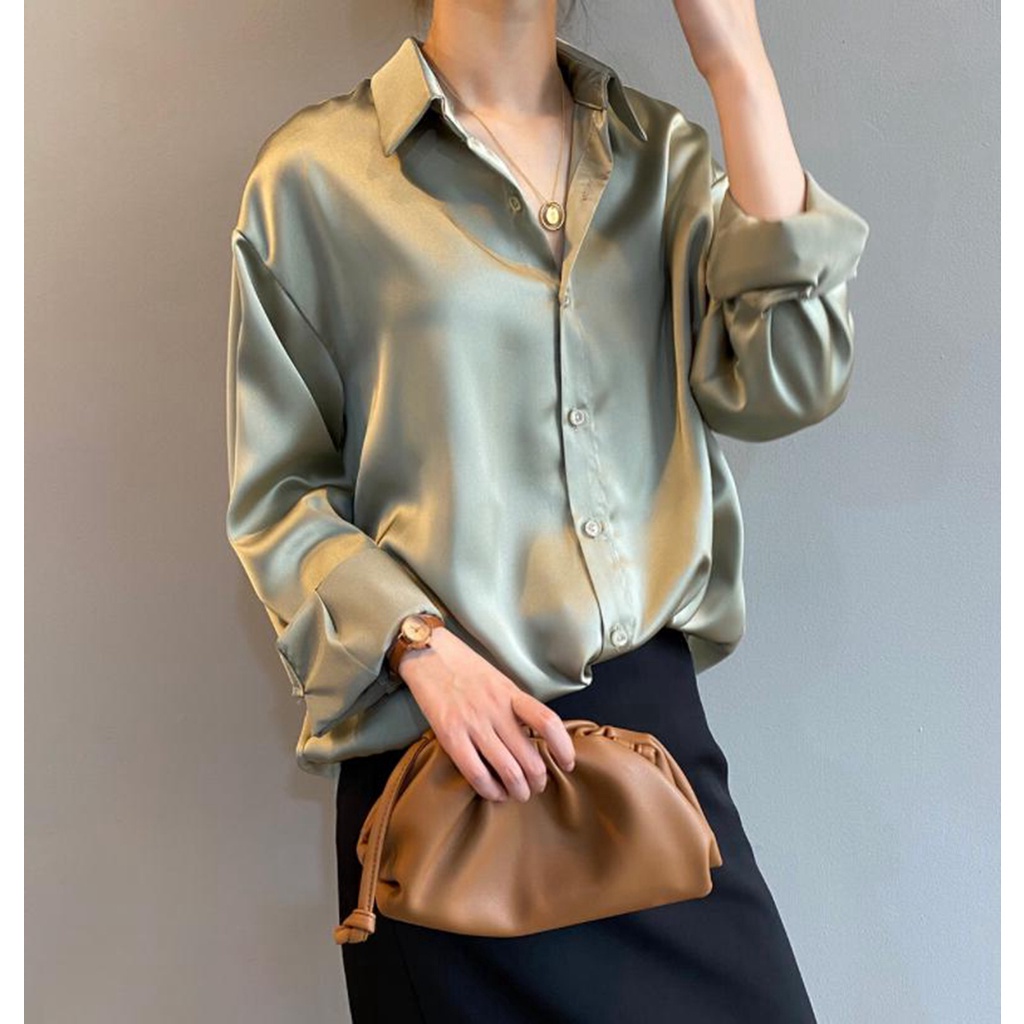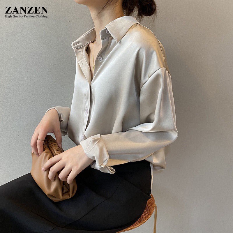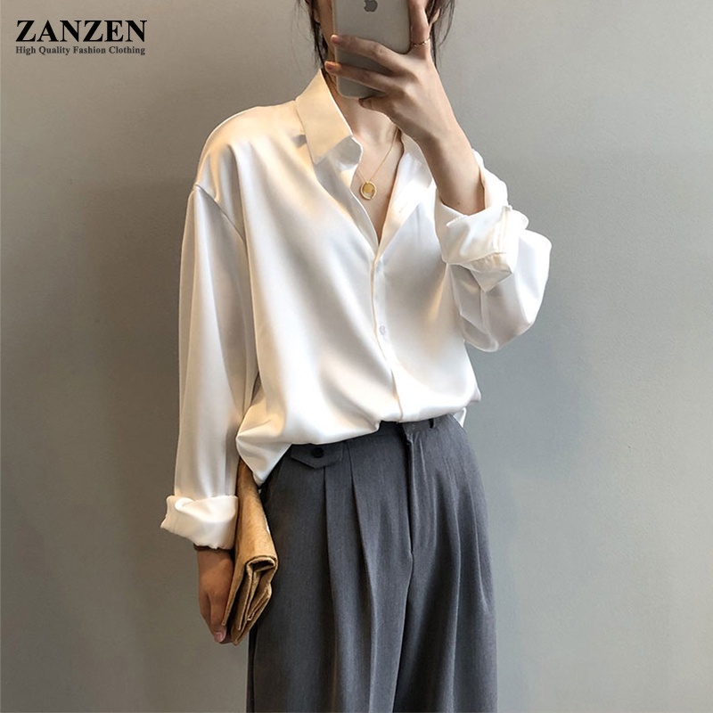 ZANZEN Kemeja Wanita Women Satin Blouse Long Sleeve Loose Blouse Kemeja Perempuan Baju Wanita Lengan Panjang Kemeja