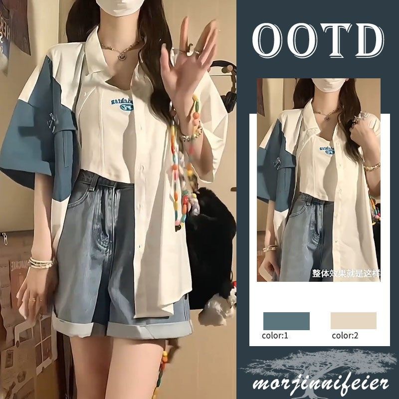 #夏季穿搭一整套女2023新款韩版洋气衬衫吊带显瘦牛仔短裤两件套 Summer outfit for women, 2023 new Korean style western-style shirt, suspender, slimming denim shorts, two