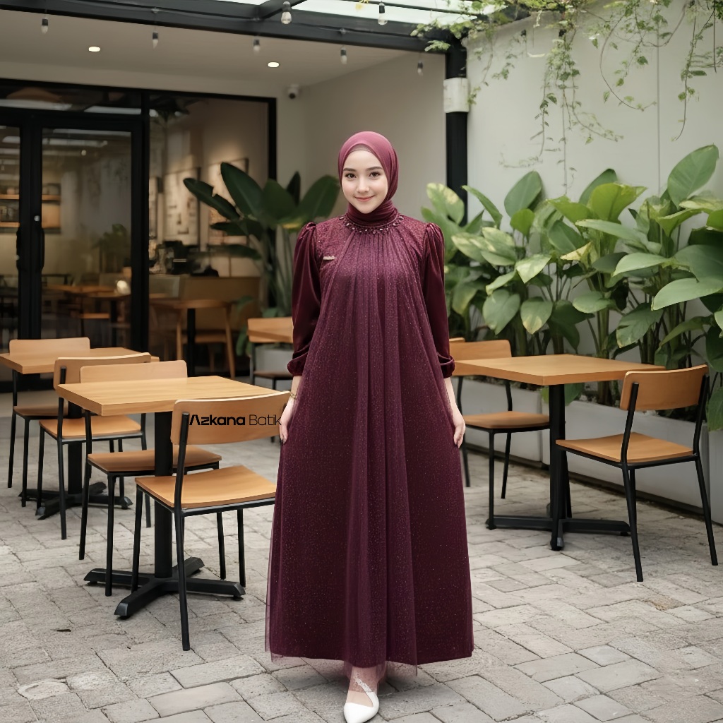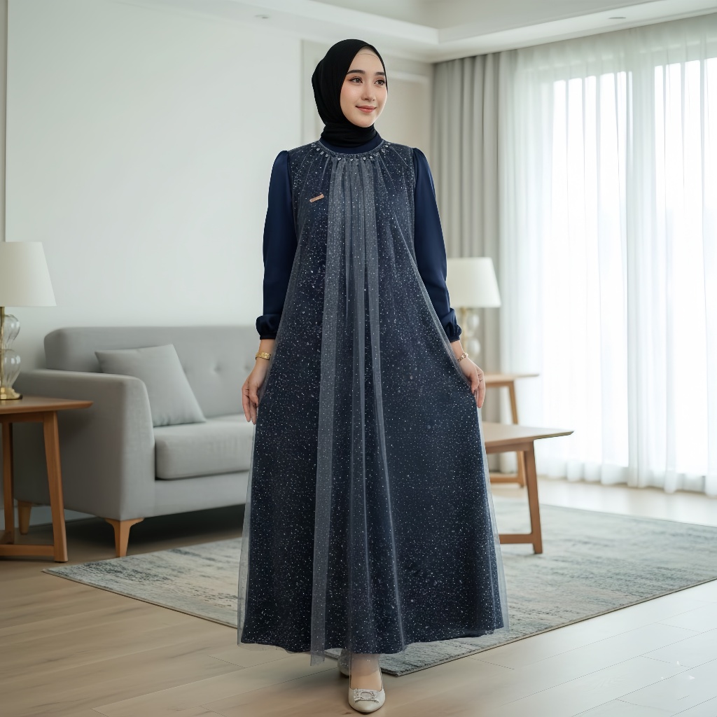 AZKANA BATIK - Elegant Luxury Snow Tille Seline Dress Navy Color Adult Women Eid Syari Dress Teenagers Party Invitation Size ML XL Eid clothes 2026 Maxi Long Dress