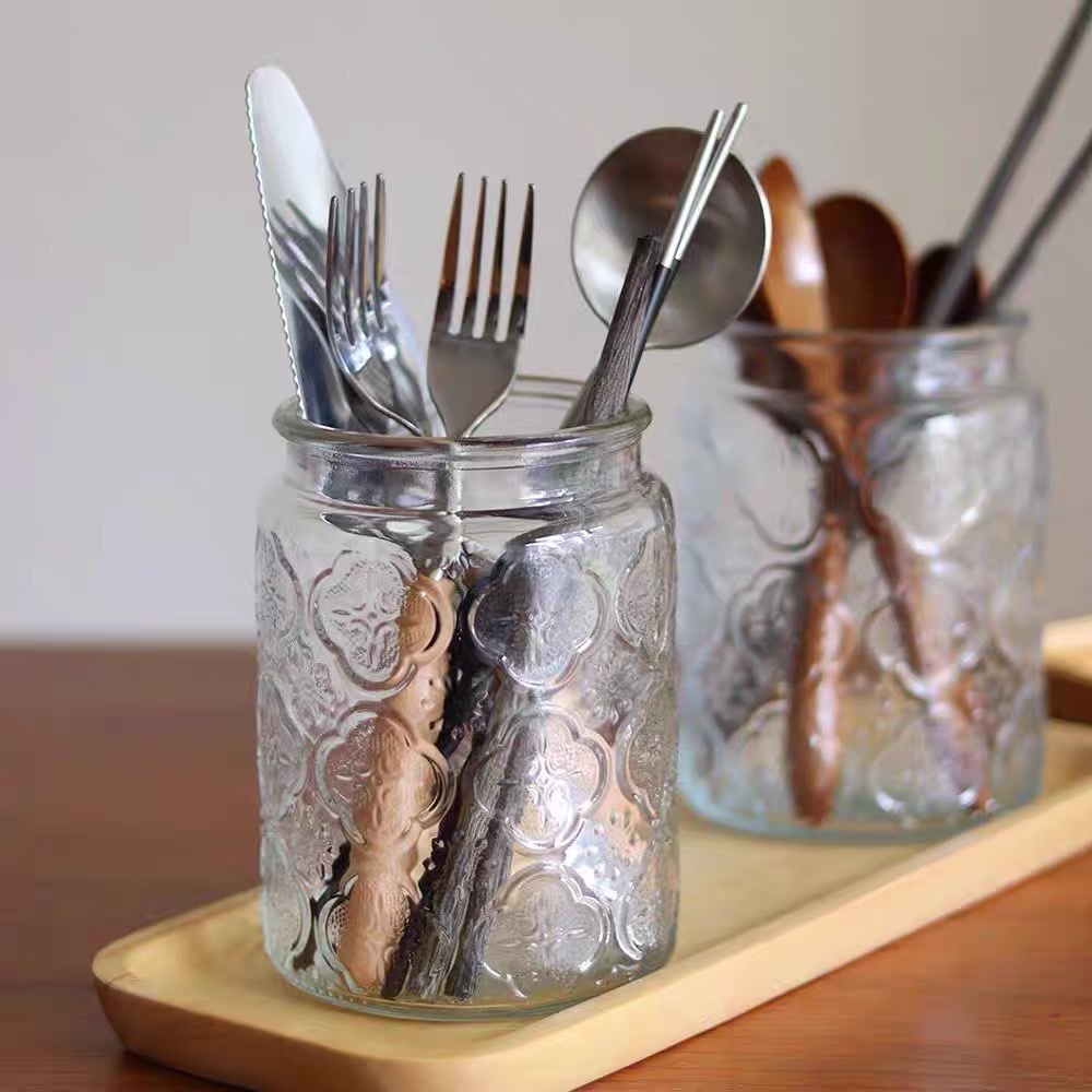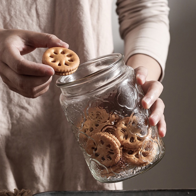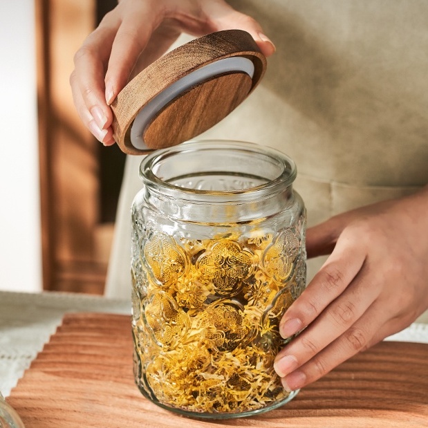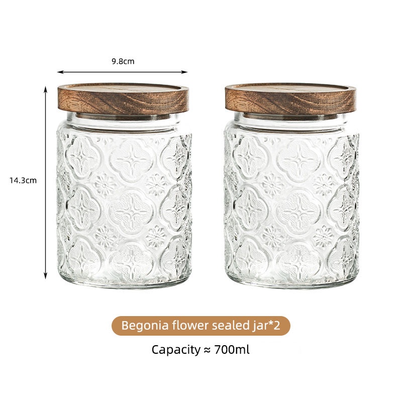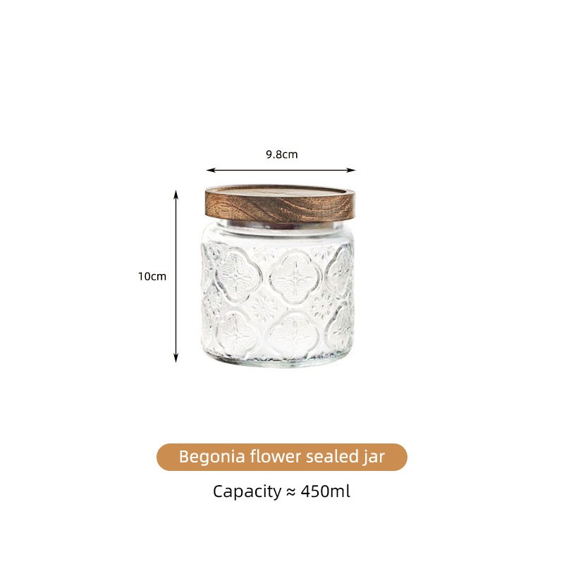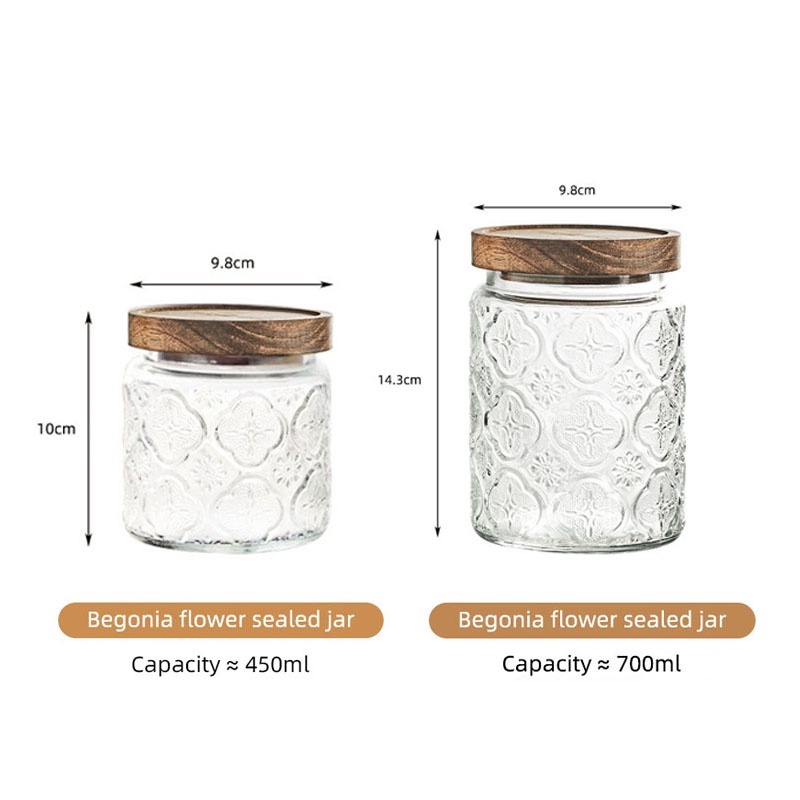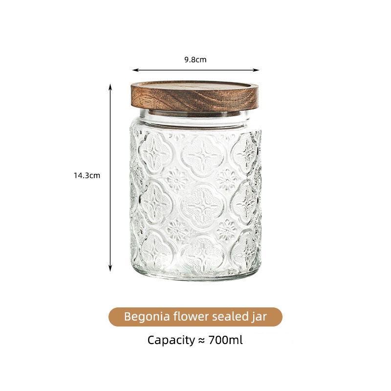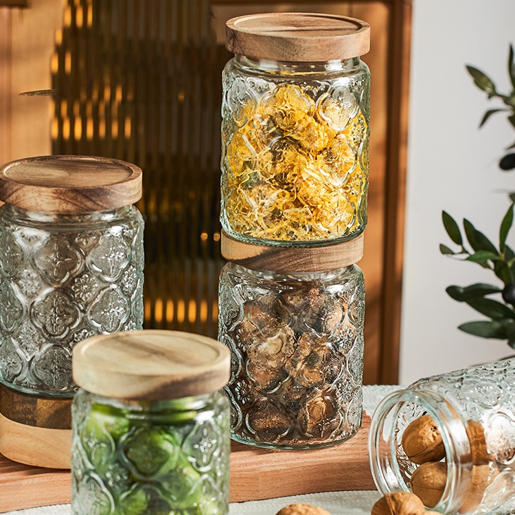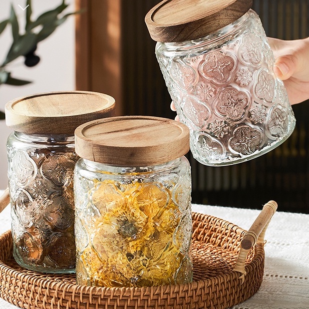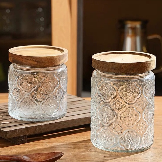 KEMORELA Vintage Glass Jar Canister Storage Jar with Seal Wooden Lid Retro Design Wood Lid Glass Airtight Canister Embossed Glass Food Storage Kitchen Storage Bottles Jars Container Candy raya