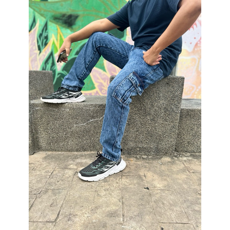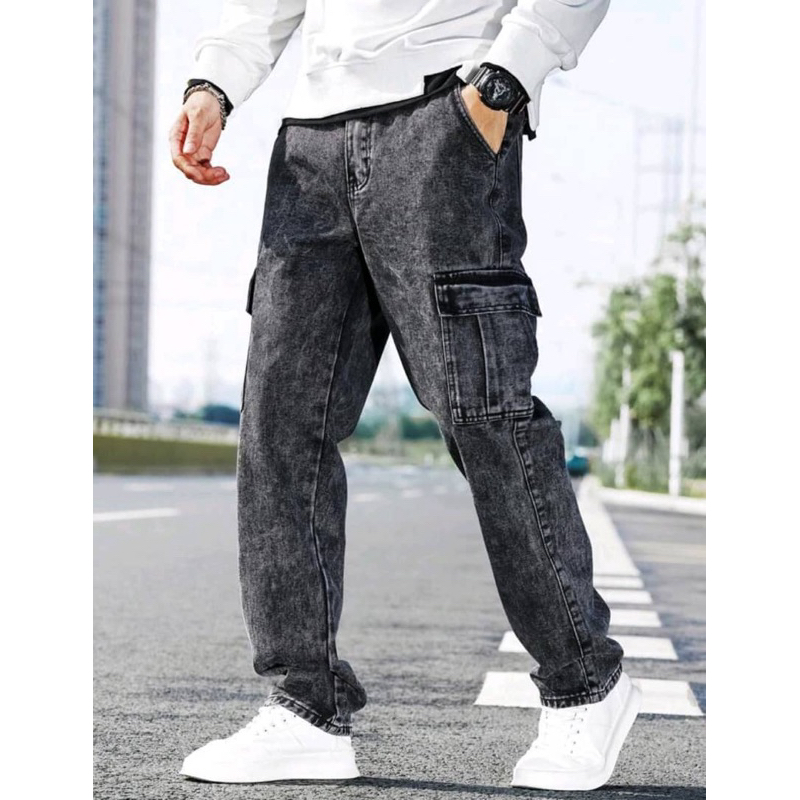 Seluar Jeans Cargo Lelaki 6 Pocket (Acid Wash). Non Stretchable kain straight cut Seluar Cargo Jeans