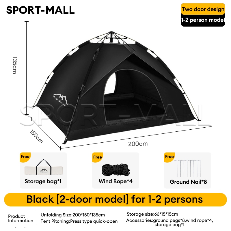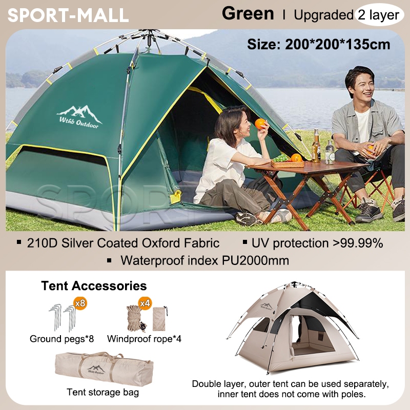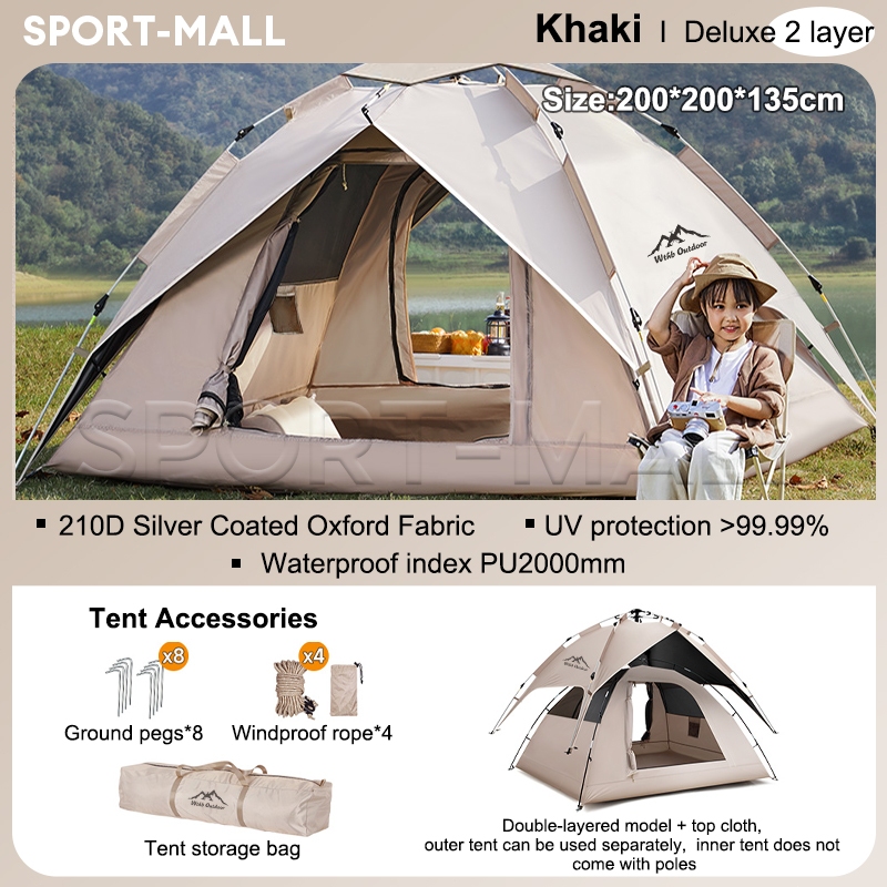 SPORT 2m*2m Khemah Camping 4 person Pop Up Tent 2 Door Outdoor camping tent waterproof Auto Tent Silver coating Anti-UV