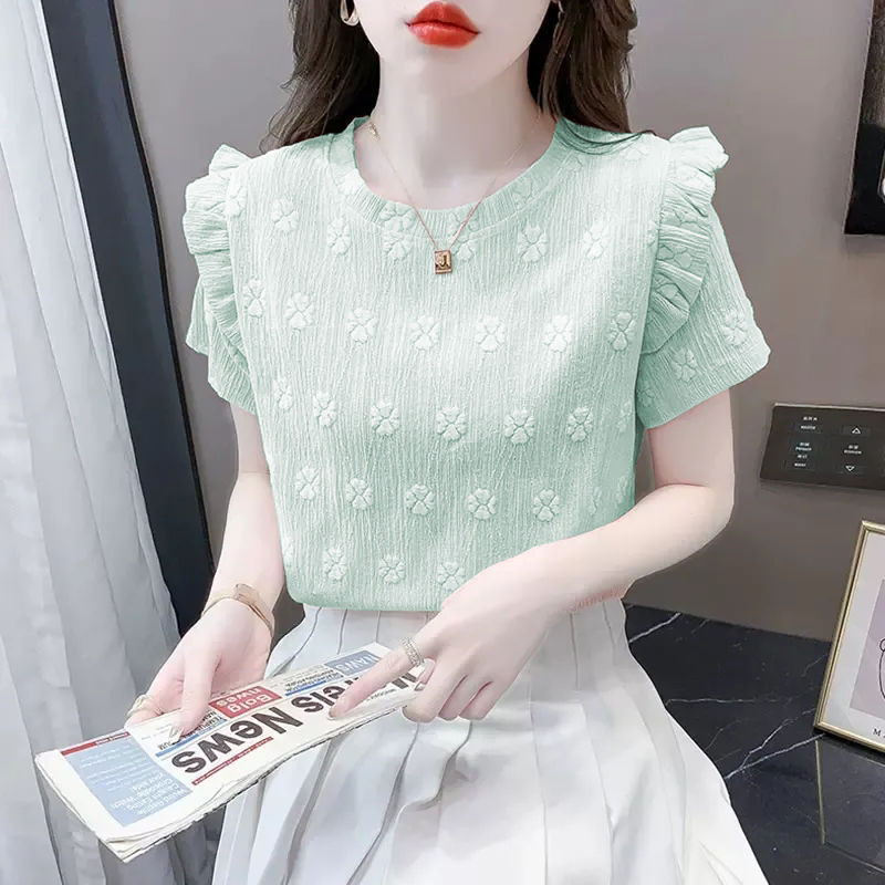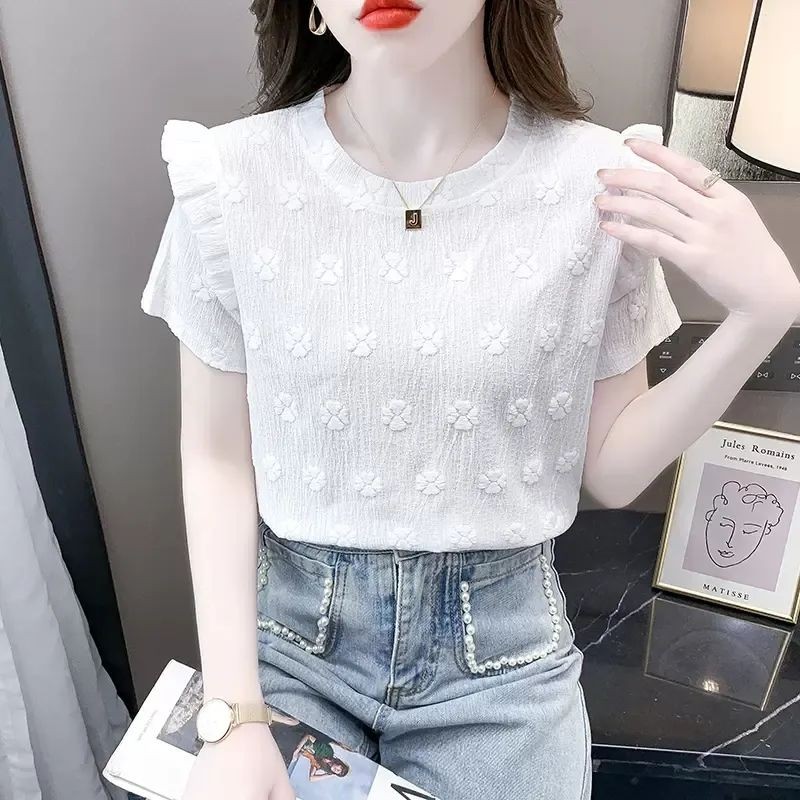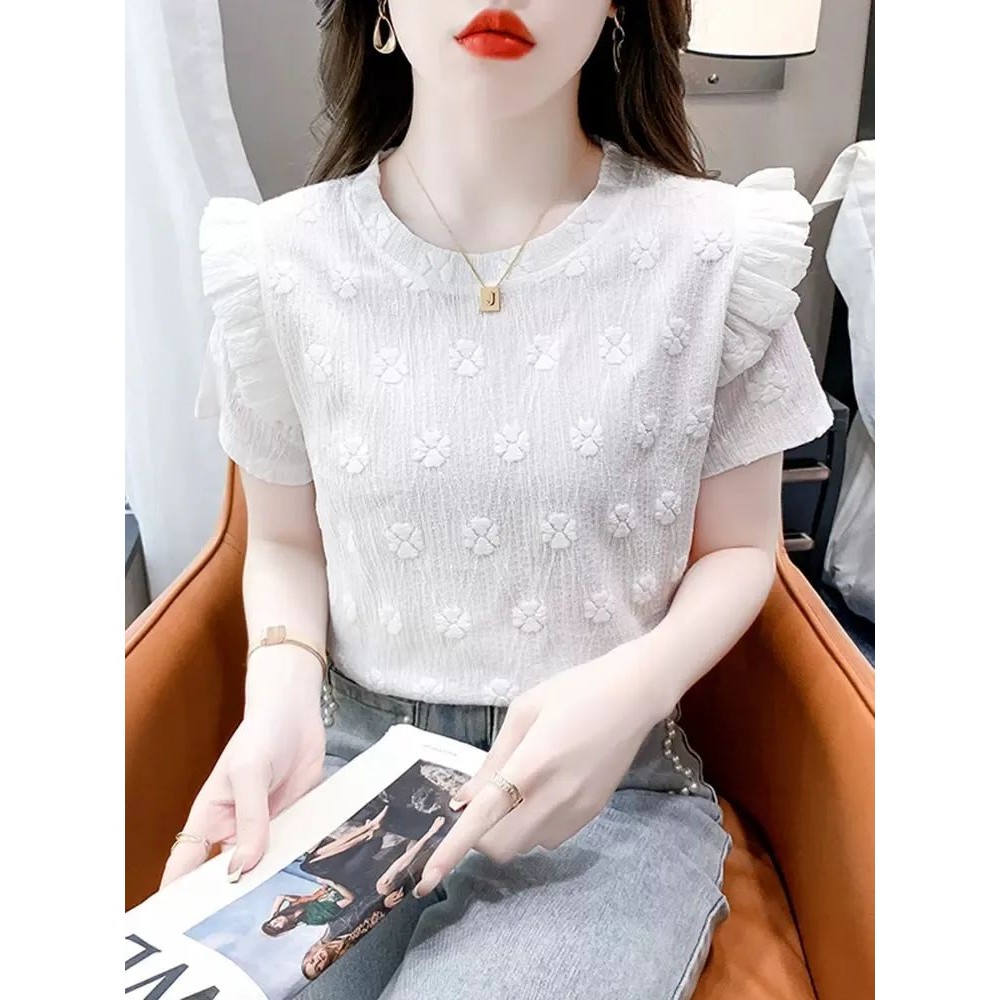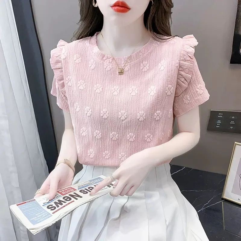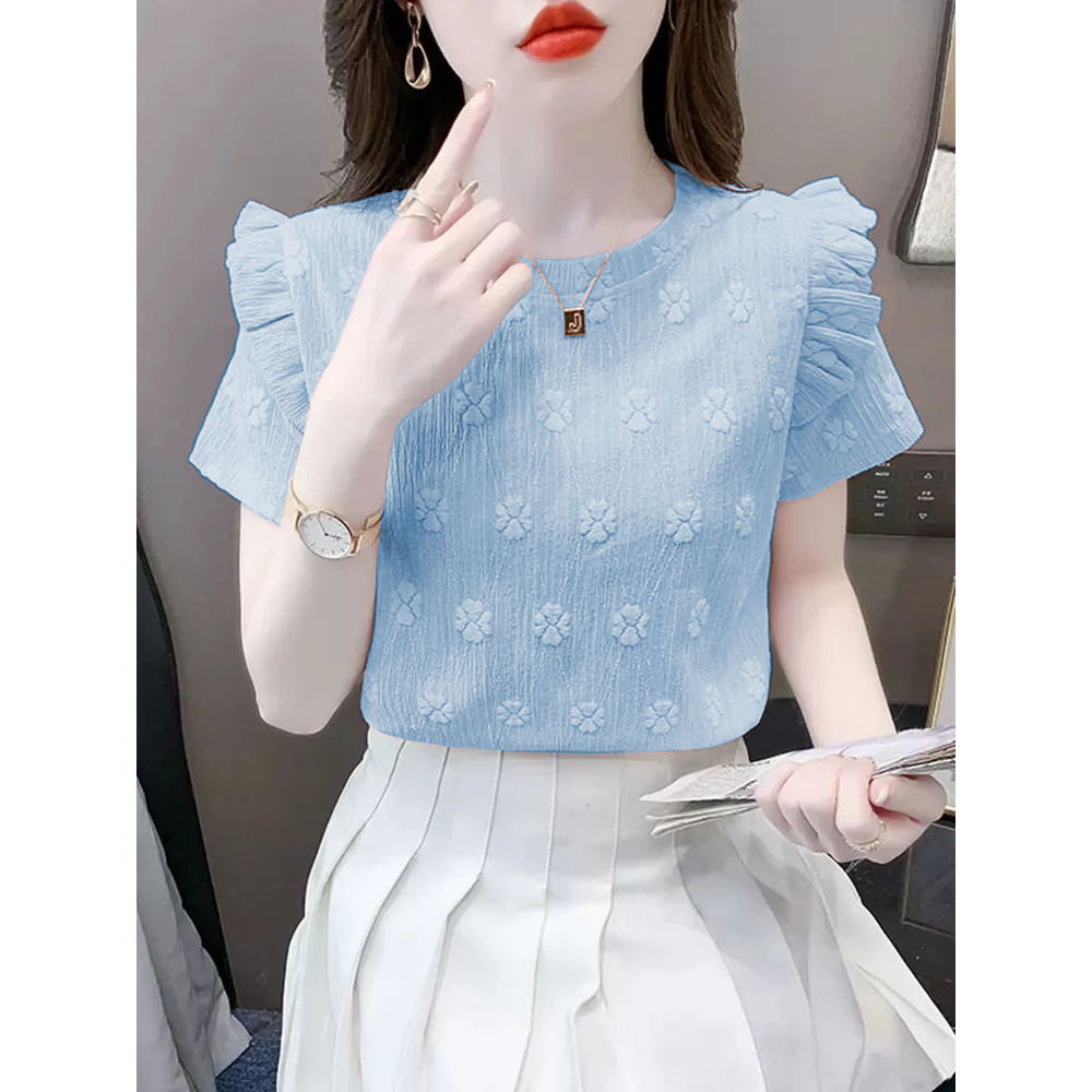 Blue Short-Sleeved T-Shirt - Loose Ruffled Design Formal Top