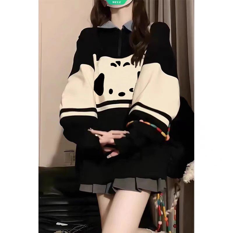 Polo Collar Colourful American Tide Pullover Sweater Women Cute Cartoon Pochacco Spring and Autumn Thin New Half-zip Loose Tops [WET]