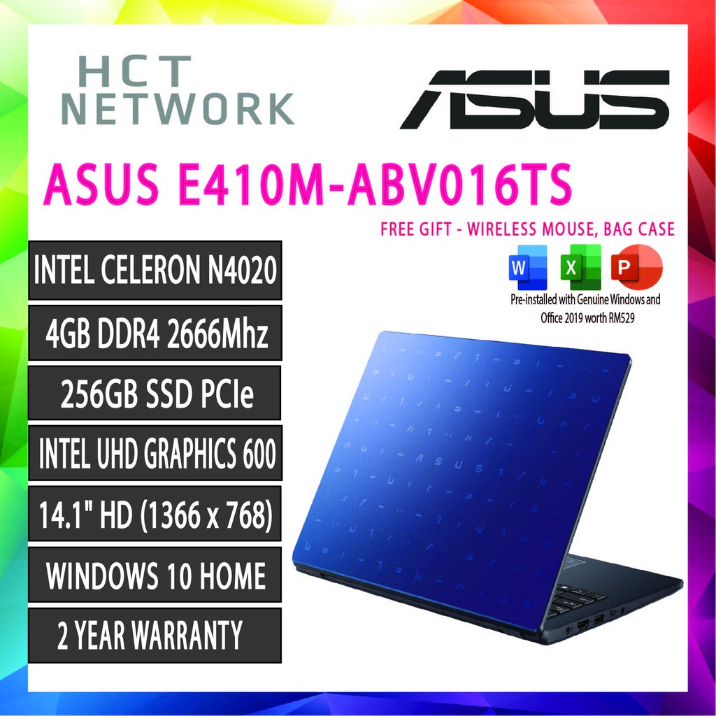 ASUS E410M-ABV016TS ASUS Laptop (Intel Core Celeron N4020, 4GB DDR4, 256GB SSD, Intel UHD Graphic, 14" Screen, Win10)