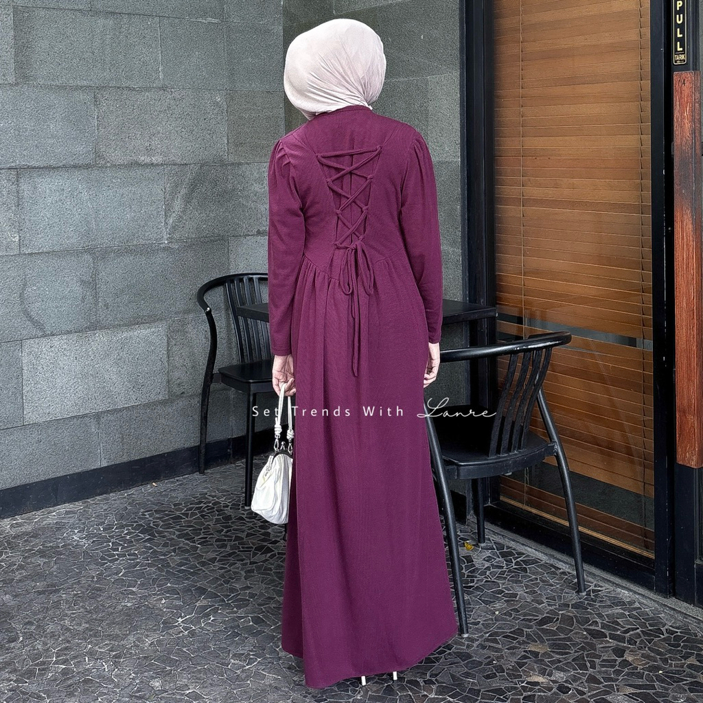 Erika Dress Knit By Lanre - Muslimah Dress with Gold Buttons, Active Flowers, Nursing Friendly, Burgundy Jubah Dress Muslimah