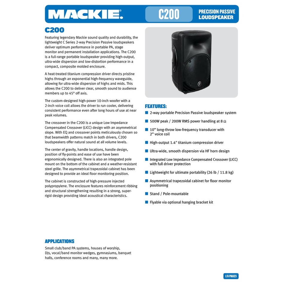 MACKIE C200 PASSIVE SPEAKER 10"INCH 200RMS 500PEAK