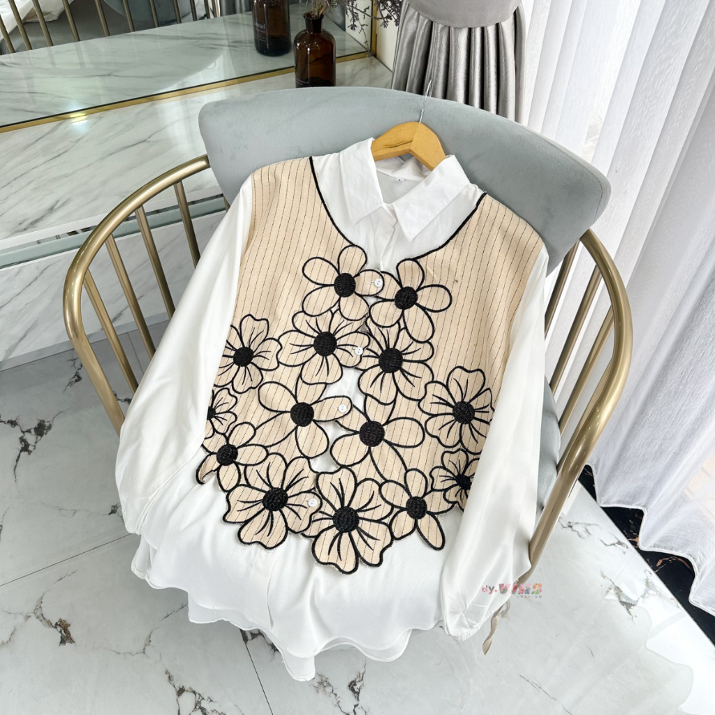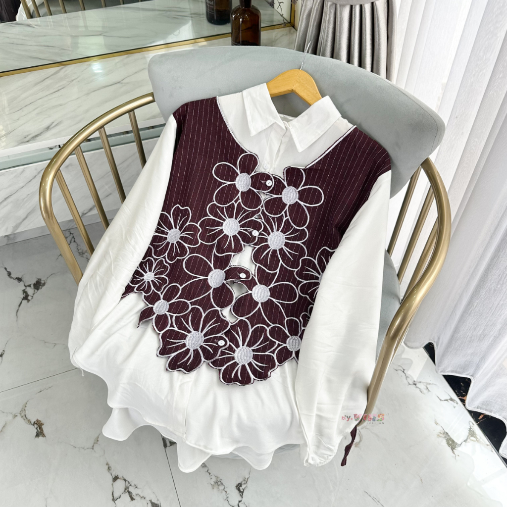 KEMEJA Maurin Premium Rayon Twill Mix Striped Shirt – Women's 2-in-1 Embroidered Vest Shirt Top Korean Style