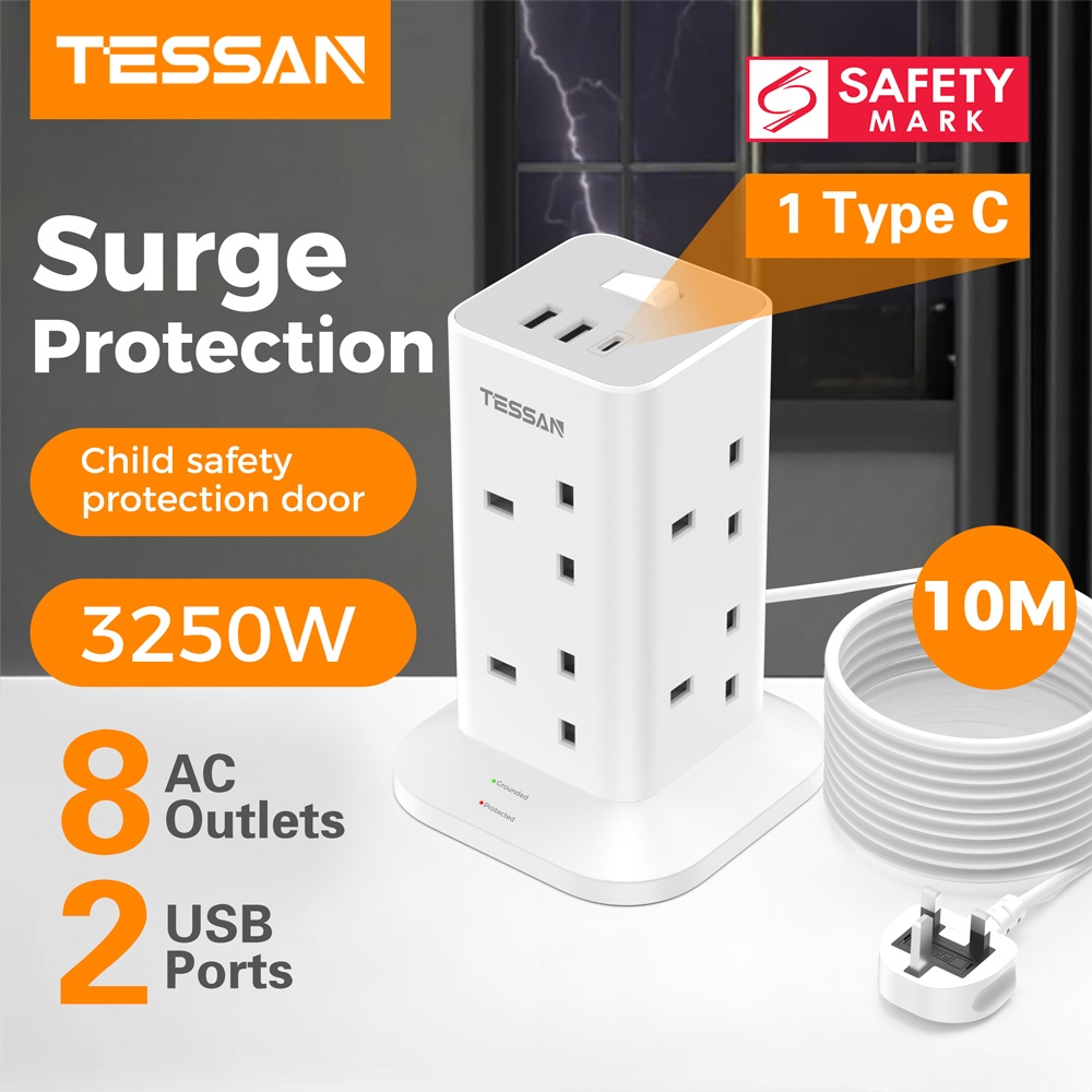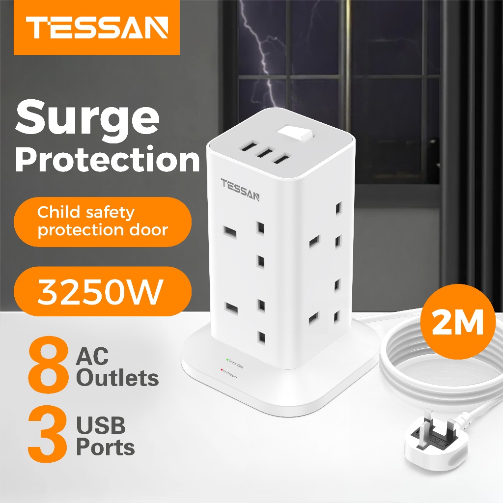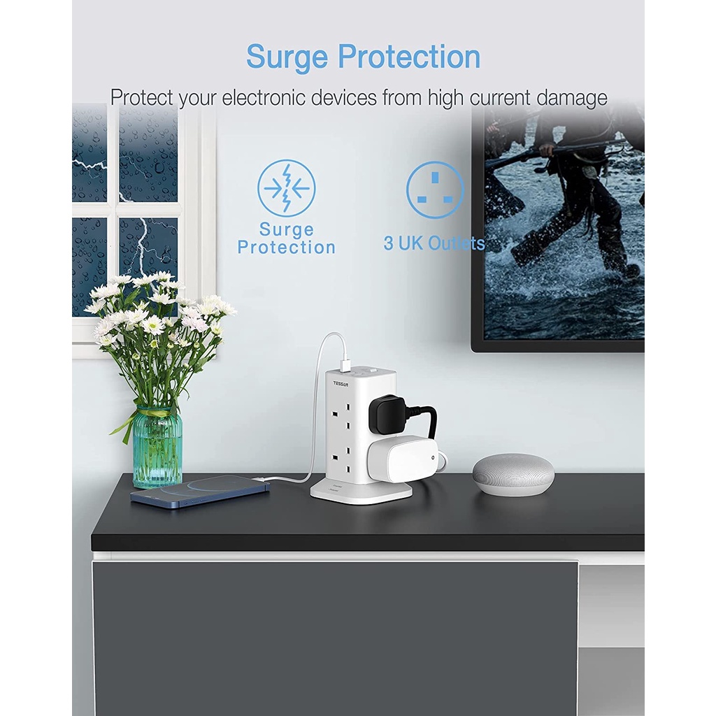 TESSAN Extension Plug Tower Extension Socket with 3 USB( C), Surge Protector Power Extension Wire