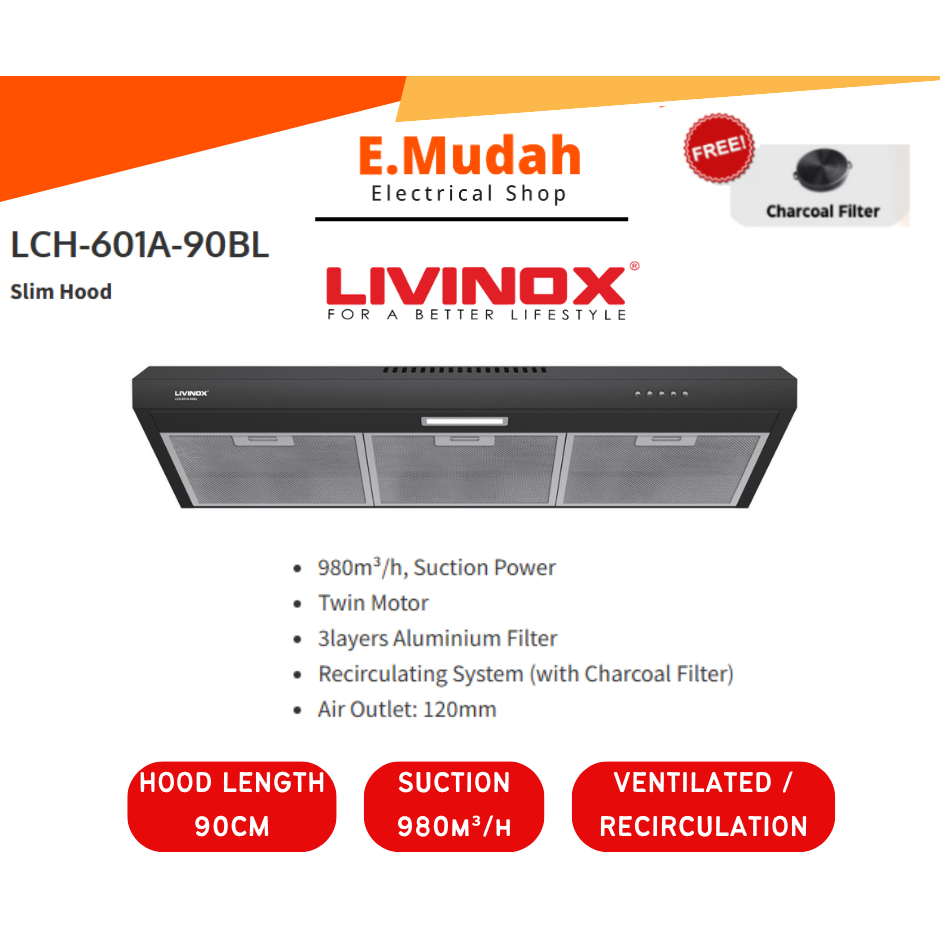Rinnai Livinox 60CM/76CM/90cm Slim Cooker Hood Matt Black Stainless Steel LED Slim Hood | RH-S95A-SSVR LCH-90L03