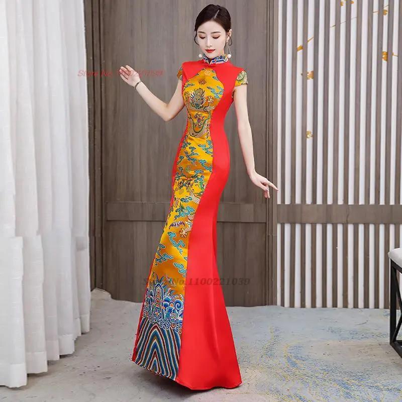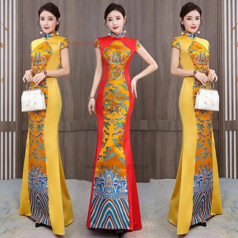 Women Traditional Chinese Improved Cheongsam Vintage Dragon Jacquard Folk Dance Evening Dress