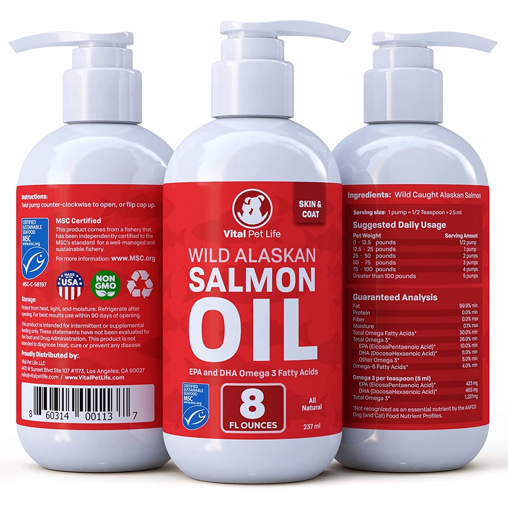 Vital Pet Life Salmon Oil for Dogs & Cats, Fish Oil Omega 3 EPA DHA Liquid Food Supplement for Pets