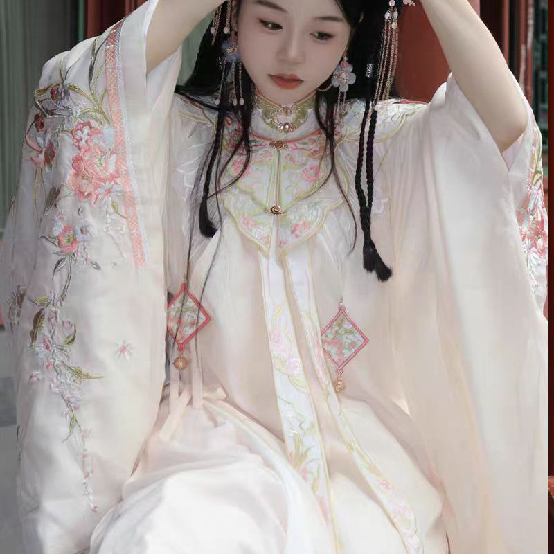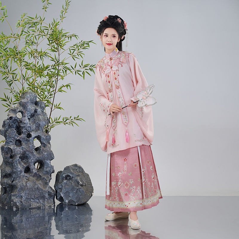 粉色明制云肩立领对襟长衫马面裙汉服三套女