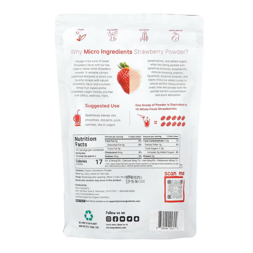 Micro Ingredients, Organic Strawberry Powder, Pure Strawberry Powder, Freeze-dried Strawberry Powder,1 lb (454 g)